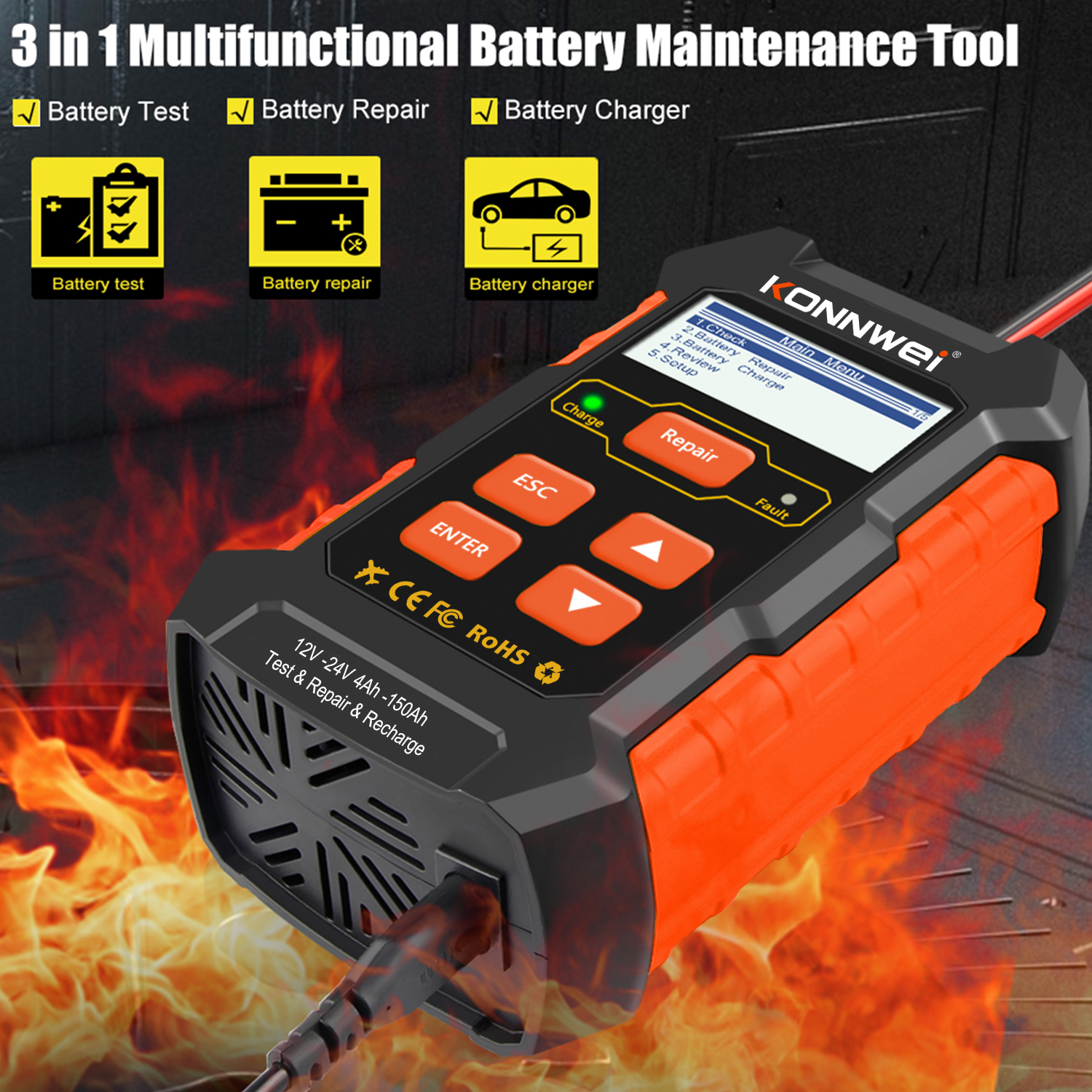 Konnwei KW520 on edistynyt monitoimilaite, joka hyödyntää huipputeknologiaa mittaamaan helposti, nopeasti ja tarkasti todellisen kylmäkäynnistyskapasiteetin, akun kunnon ja yleisimmät viat ajoneuvon käynnistys- ja latausjärjestelmissä. KW520 on erityisen hyödyllinen autokorjaamoissa, koska se pystyy paikantamaan ongelman, mikä mahdollistaa nopeat ajoneuvojen korjaukset.