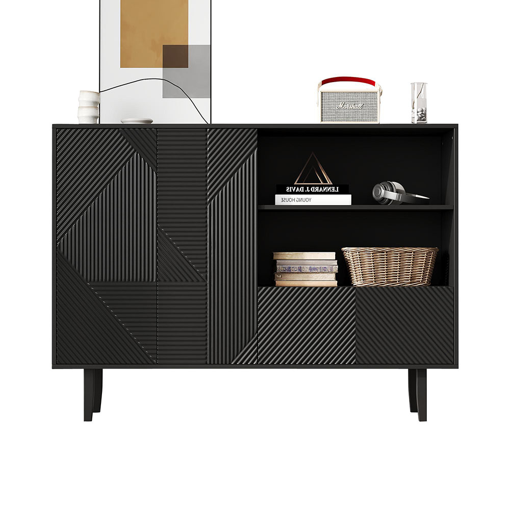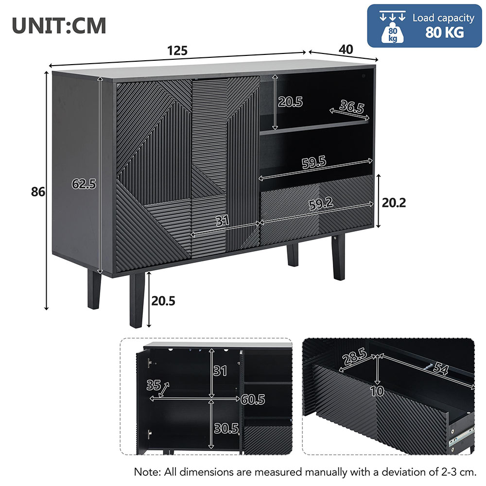 KOMHTOM-sivukaappi yhdistää kestävän lastulevyrakenteen ja käytännöllisen muotoilun. Musta pinta ja aaltomainen kuviointi tuovat huoneeseen hillittyä ilmettä. Tukeva rakenne pitää tavarat turvassa sekä pinnalla että kaapin sisällä. Kaapin ulkomitat tekevät siitä sopivan niin pieniin kuin suuriin tiloihin, tarjoten samalla runsaasti säilytyspaikkaa.