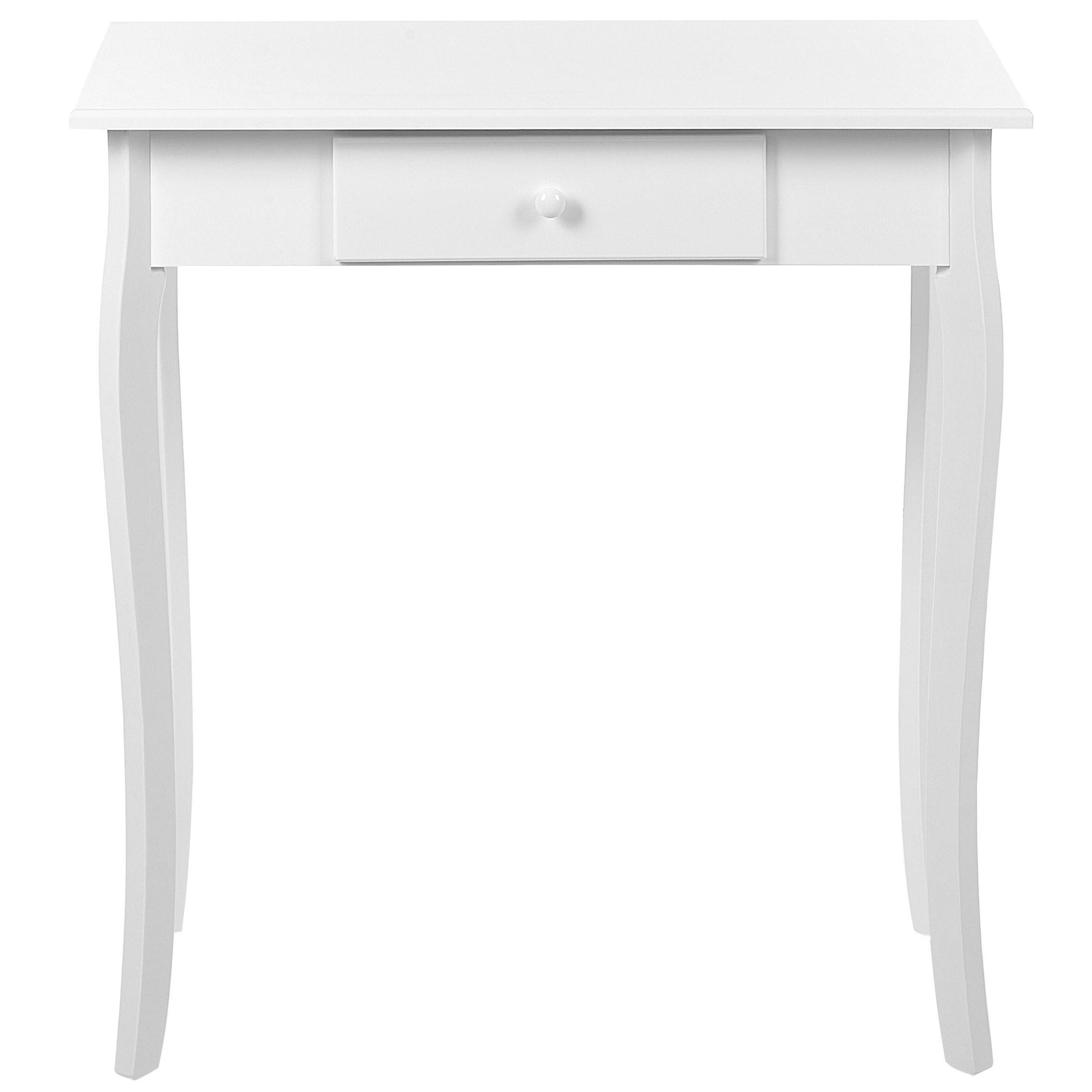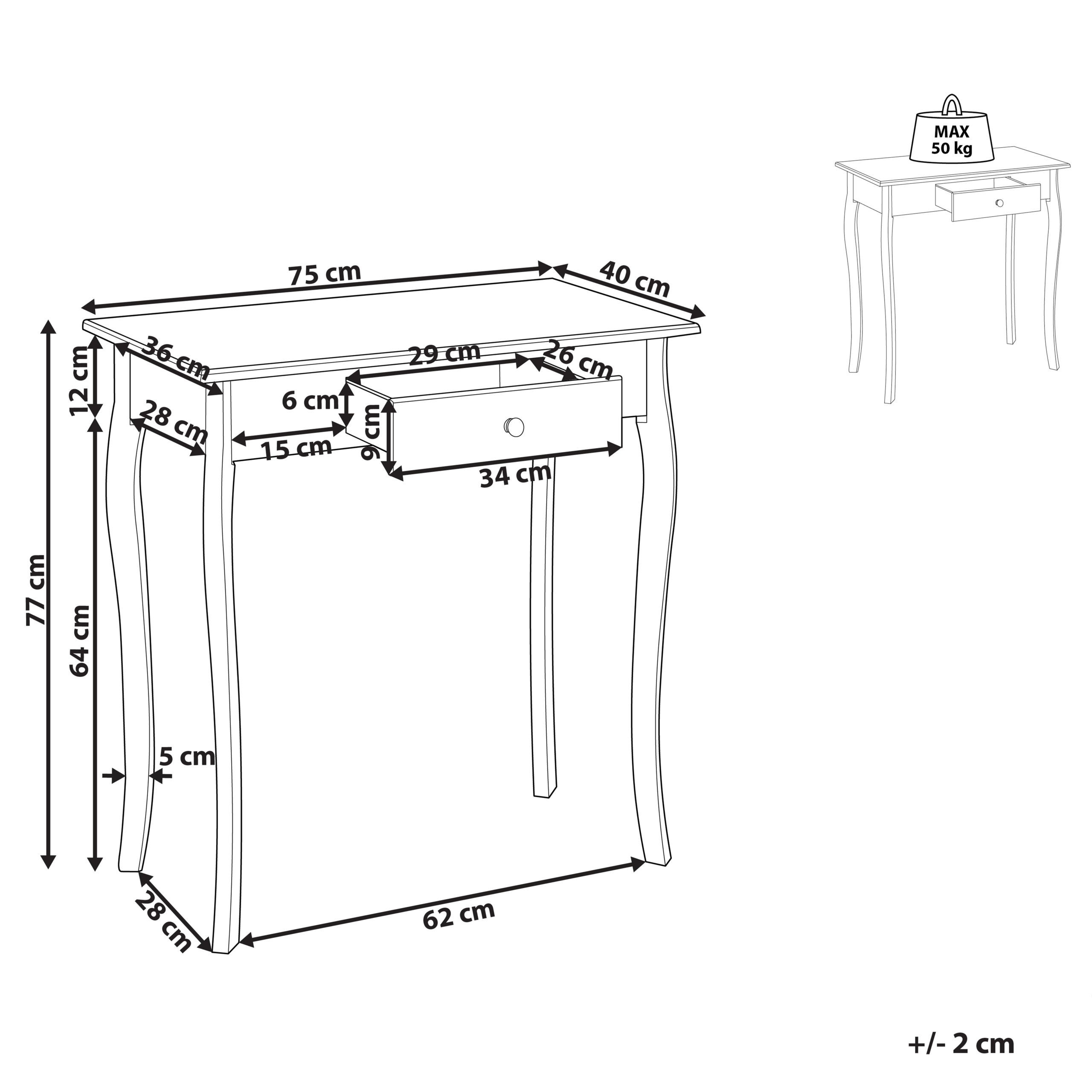 Ranskalaistyylin innoittama konsolipöytä. Tämä ylellinen konsolipöytä sopii täydellisesti sekä olohuoneeseen että eteiseen, tuoden ripauksen provencelaista tyyliä sisustukseesi. Käytännöllinen laatikko tarjoaa tilaa tarpeellisille pikkuesineille, kuten avaimille tai passille. Kauniisti kaartuvat, viktoriaaniset jalat on valmistettu vankasta ja korkealaatuisesta männystä, joka korostaa MDF-levystä valmistettua runkoa kauniisti.