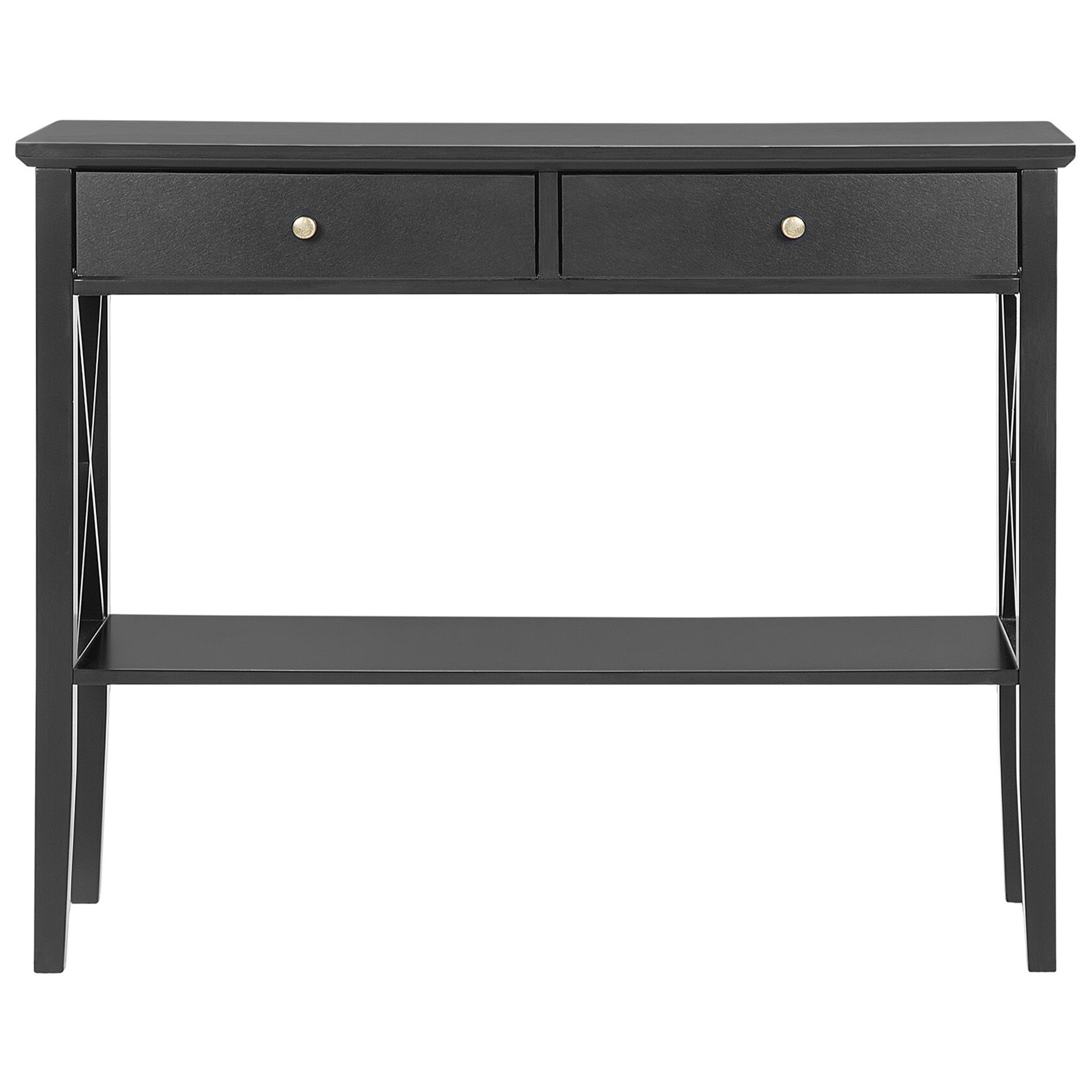 Rustiikkinen konsolipöytä laatikoilla. Käytännöllinen ja tyylikäs konsolipöytä sulautuu täydellisesti moderneihin, maalaismaisiin tai rustiikkisiin sisustuksiin. Korkealaatuisesta ja kestävästä MDF-levystä valmistettu pöytä omaa yksinkertaisen, puhtaan muotoilun. Tilavat laatikot tarjoavat runsaasti säilytystilaa erilaisille tarpeellisille esineille, kuten avaimille tai lehdille. Alaosan avonainen hylly sopii täydellisesti koriste-esineille tai säilytyskoreille. Anna sisustuksellesi raikas ilme tällä ylellisellä mutta hillityllä konsolipöydällä.