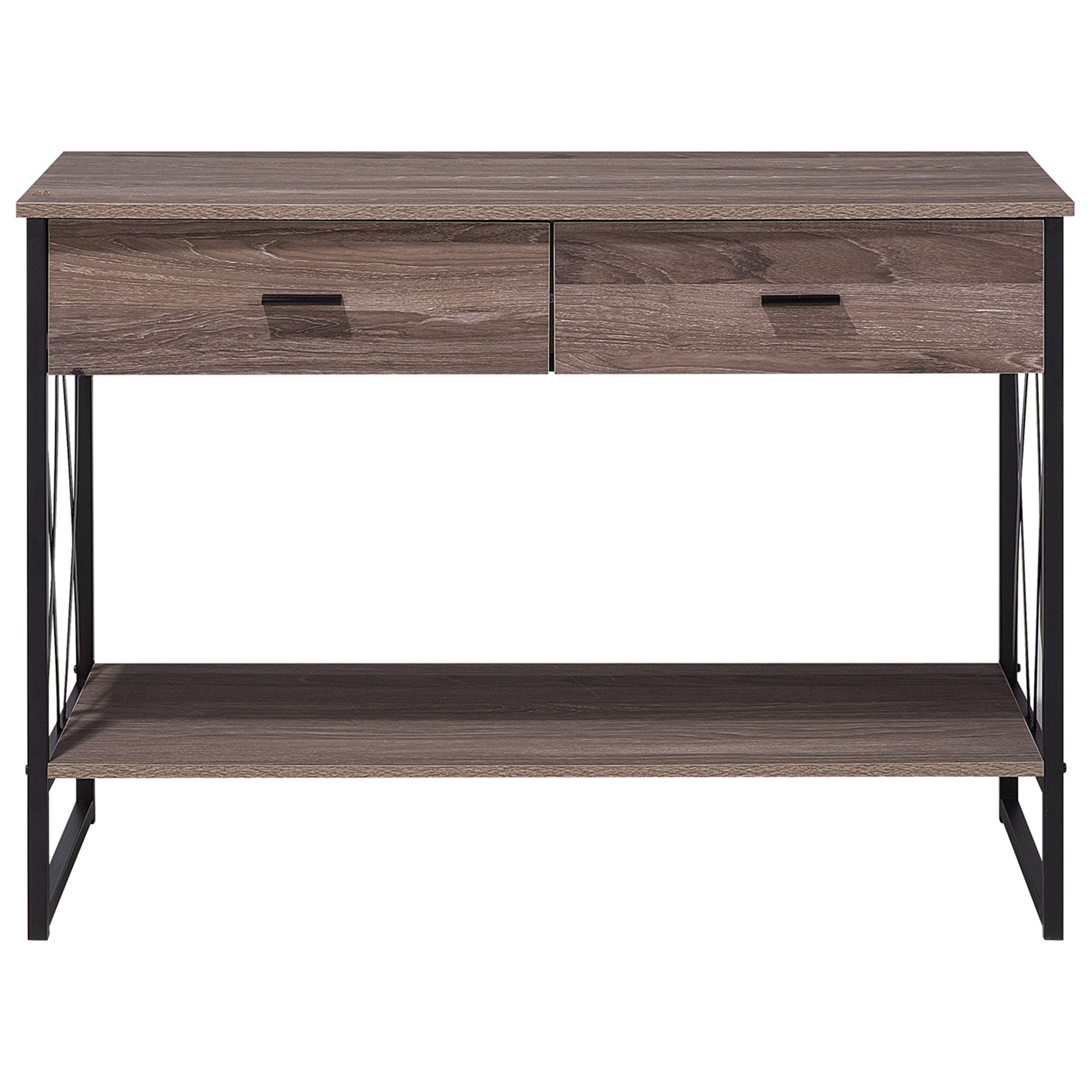 Tyylikäs konsolipöytä laatikoilla ja hyllyllä. Tämä kahdella laatikolla varustettu konsolipöytä sopii täydellisesti eteiseen, olohuoneeseen tai makuuhuoneeseen. Käytännöllisen ja tyylikkään muotoilunsa ansiosta se sopii useisiin erilaisiin sisustuksiin. Käytännölliset laatikot tarjoavat paljon tilaa erilaisille lehdille ja tarpeellisille pikkuesineille, kuten avaimille tai kosmetiikkatuotteille. Leveä pöytälevy ja hylly tarjoavat paljon tilaa erilaisten sisustustarvikkeiden esittelyyn. Melamiinipäällysteiset, kauniin ruskeanharmaat pinnat ja mustaksi jauhemaalattu metallirunko antavat konsolipöydälle industriaalista tyyliä.
