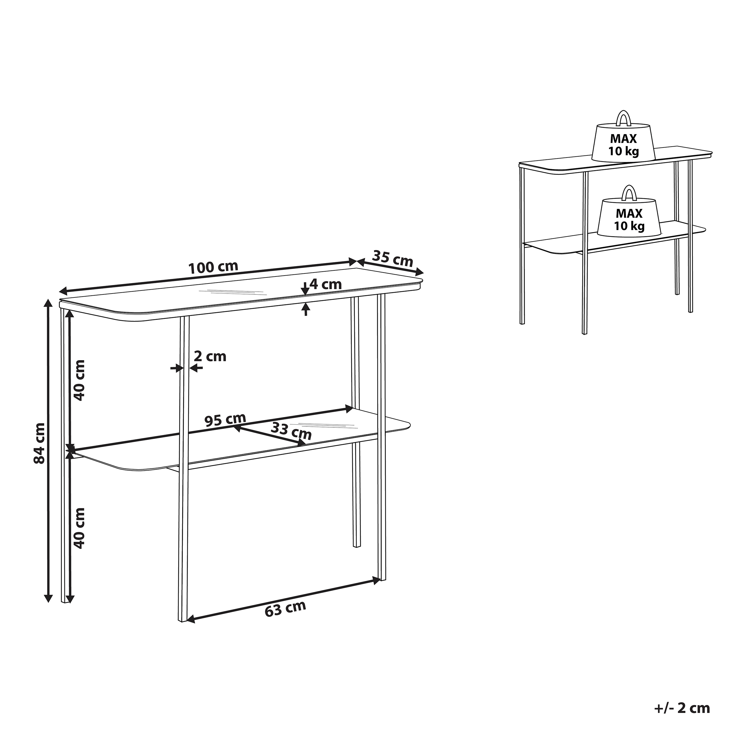 Koristeellinen konsolipöytä lasitasolla. Tuo ylellisyyttä ja käytännöllisyyttä kotiisi tällä tyylikkäällä konsolipöydällä. Kaksi lasista, marmorikuvioinnilla viimeisteltyä pöytälevyä täydentävät varmasti olohuoneen, makuuhuoneen tai eteisen ilmettä. Konsolipöytä tarjoaa paljon tilaa erilaisille koristeille, maljakoille tai säilytyskoreille. Vankka, kiiltävä teräsrunko korostaa konsolipöydän tasoja kauniisti, saaden sen sopimaan niin moderneihin kuin glamour-tyylisiinkin sisustuksiin.