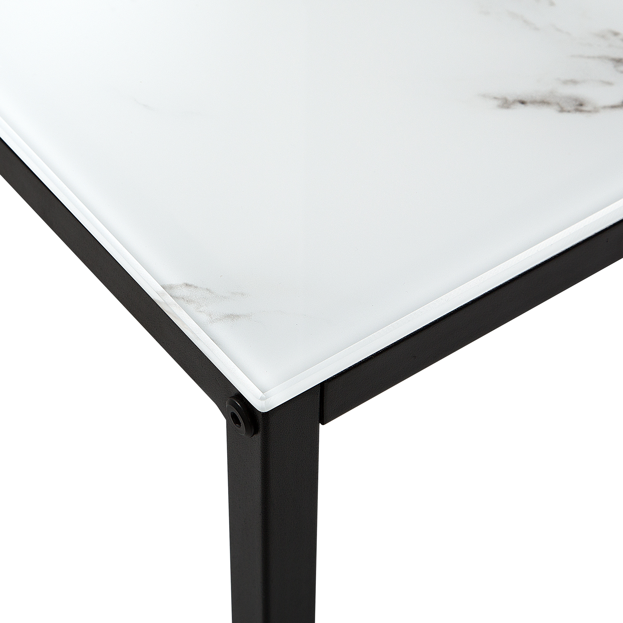Glamour-tyylinen suorakulmainen konsolipöytä. Tämä moderni konsolipöytä on saanut inspiraationsa ylellisestä vuosisadan puolivälin muotoilusta. Konsolipöydän avoin runko on valmistettu mustaksi jauhemaalatusta metallista. Pöytälevy on valmistettu karkaistusta lasista, joka on viimeistelty valkoisella marmorikuviolla. Leveä pöytälevy ja ainutlaatuinen muotoilu luovat tyylikkään ja käytännöllisen kokonaisuuden, joka antaa kodin sisustukselle ylellisen ilmeen.