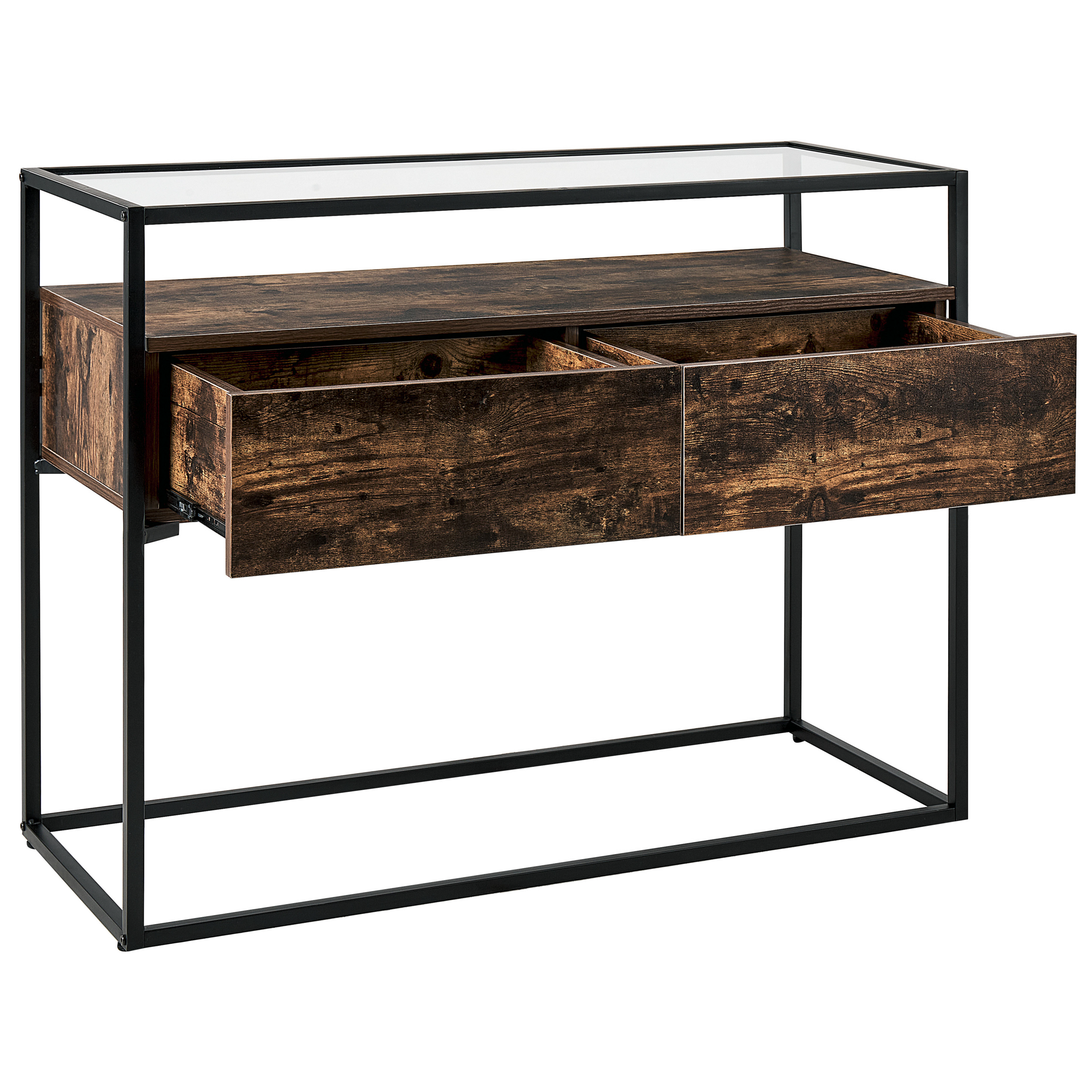Rustiikkinen konsolipöytä metallirungolla. Kohota sisustuksesi ilmettä tällä ylellisellä, tumman puun sävyisellä konsolipöydällä. Se sopii täydellisesti sekä olohuoneeseen, eteiseen että makuuhuoneeseen, tarjoten käytännöllisen säilytystilan ja tuoden sisustukseen ripauksen industriaalista tyyliä. Pöydässä on kaksi tilavaa laatikkoa, jotka tarjoavat tilaa tarpeellisille pikkuesineille, sekä karkaistu lasitaso, jolle voit asettaa suosikkikoristeesi, pöytävalaisimen tai valokuvia. Vankka metallirunko antaa konsolipöydälle modernin, suoraviivaisen ilmeen.