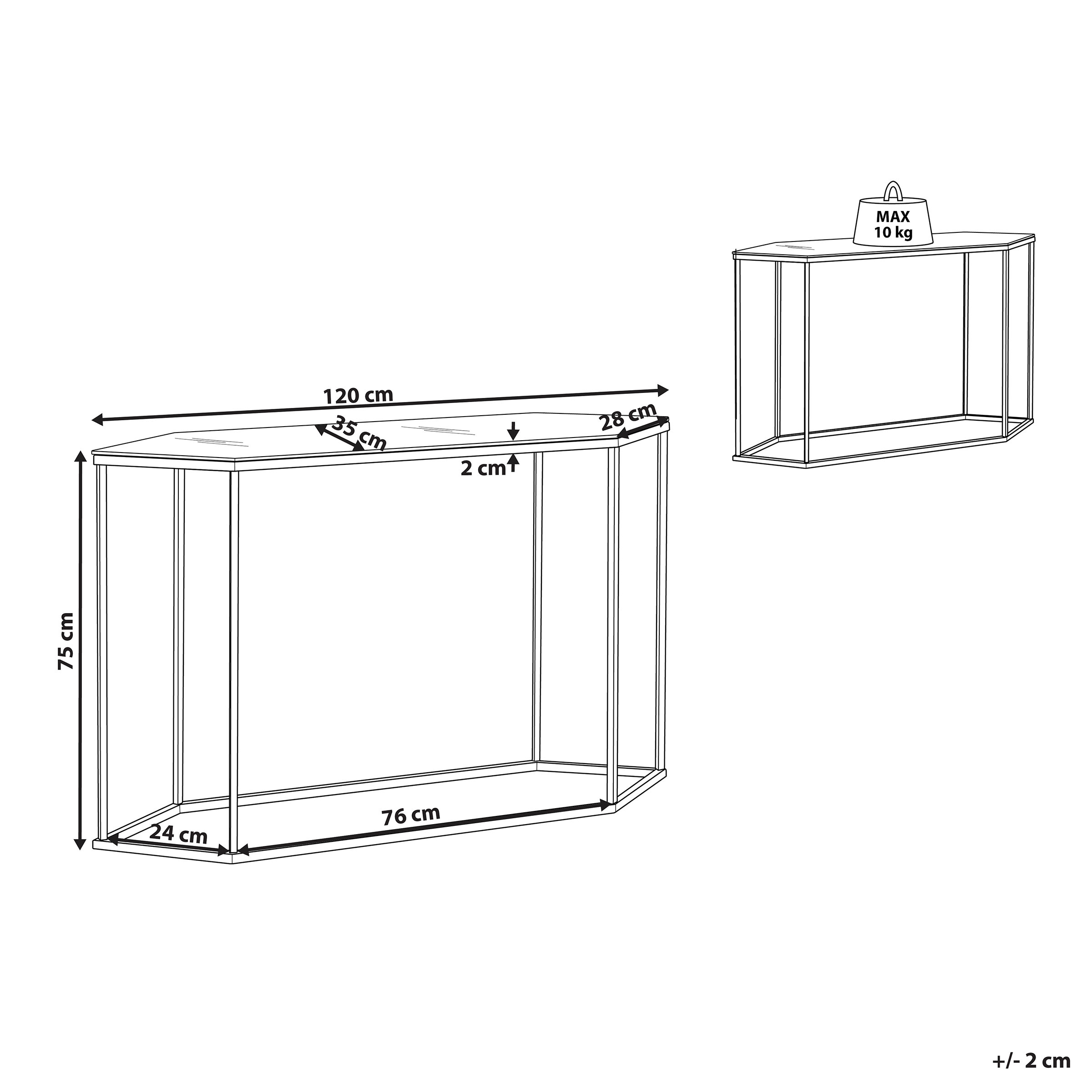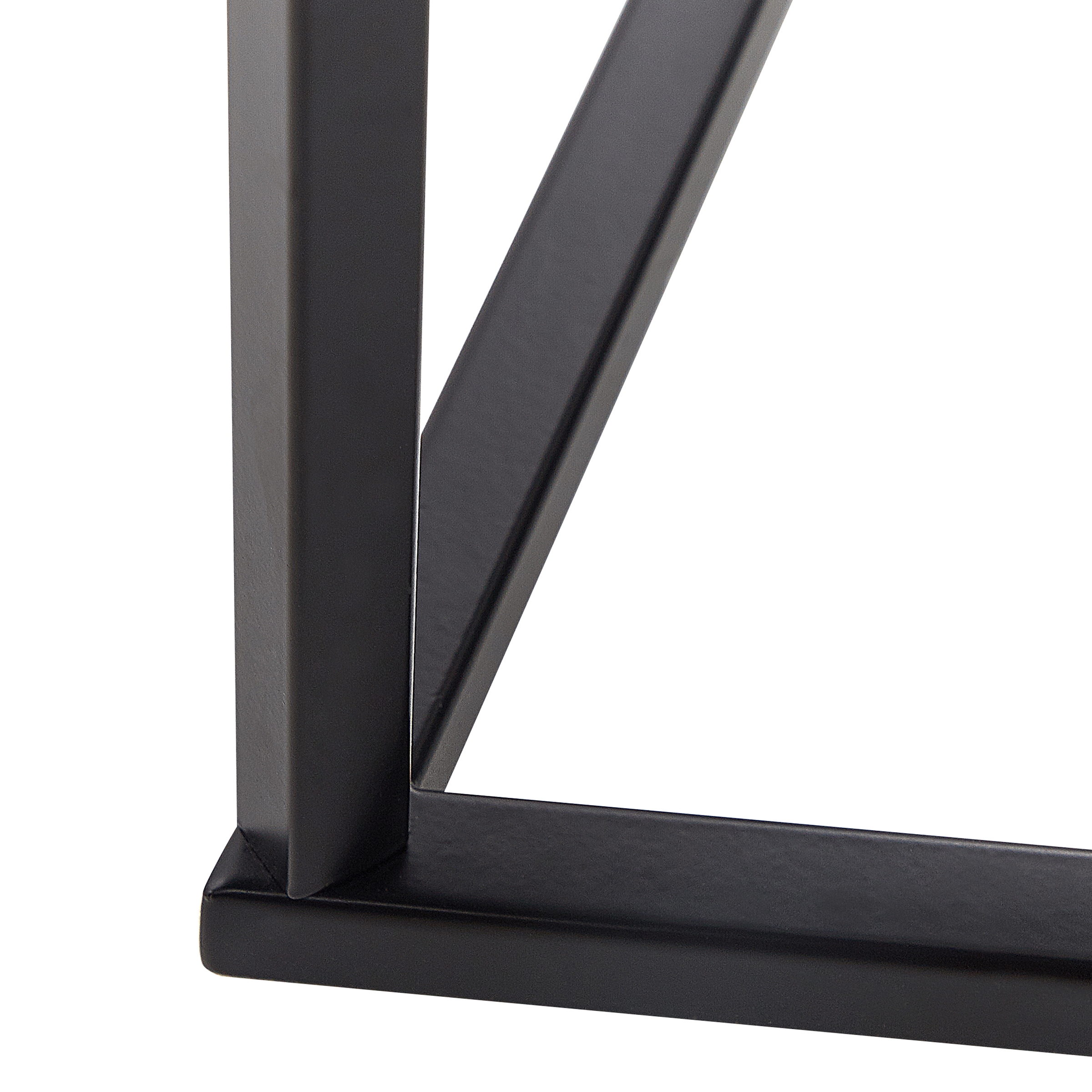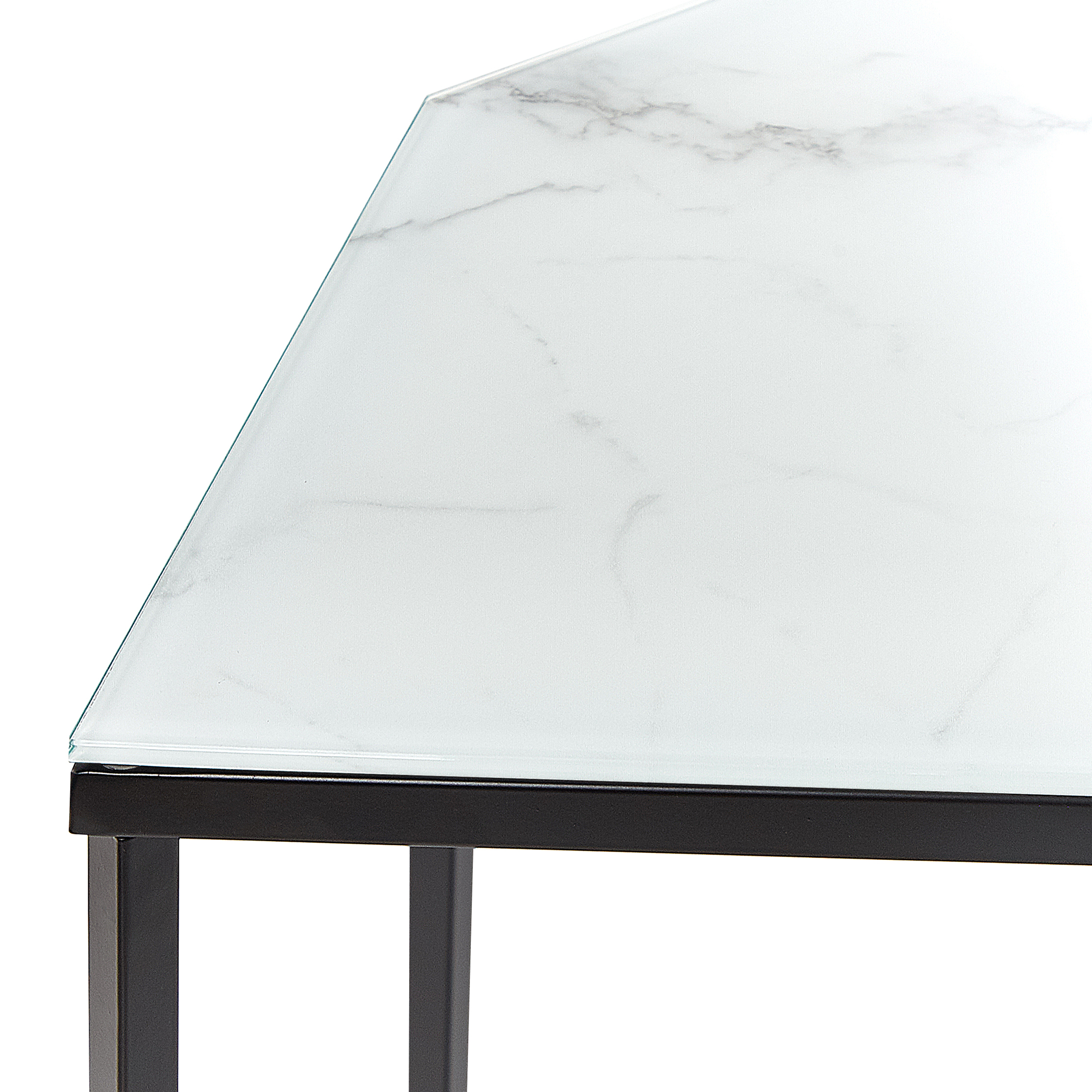 Elegantti konsolipöytä lasitasolla. Tuo ripaus glamour-tyyliä sisustukseesi tällä ainutlaatuisella, geometrisen muotoisella konsolipöydällä. Sijoita se olohuoneeseen tai eteiseen sivupöydäksi, jossa esitellä koriste-esineitä tai säilyttää tarpeellisia pikkutavaroita, tai makuuhuoneeseen kampauspöydäksi. Konsolipöydän karkaistu lasitaso on laminoitu marmorikuvioidulla PVC-kalvolla, joka lisää pöytään ylellistä tuntua. Mustaksi jauhemaalattu teräsrunko takaa vakauden, täydentäen pöytälevyä kauniisti.