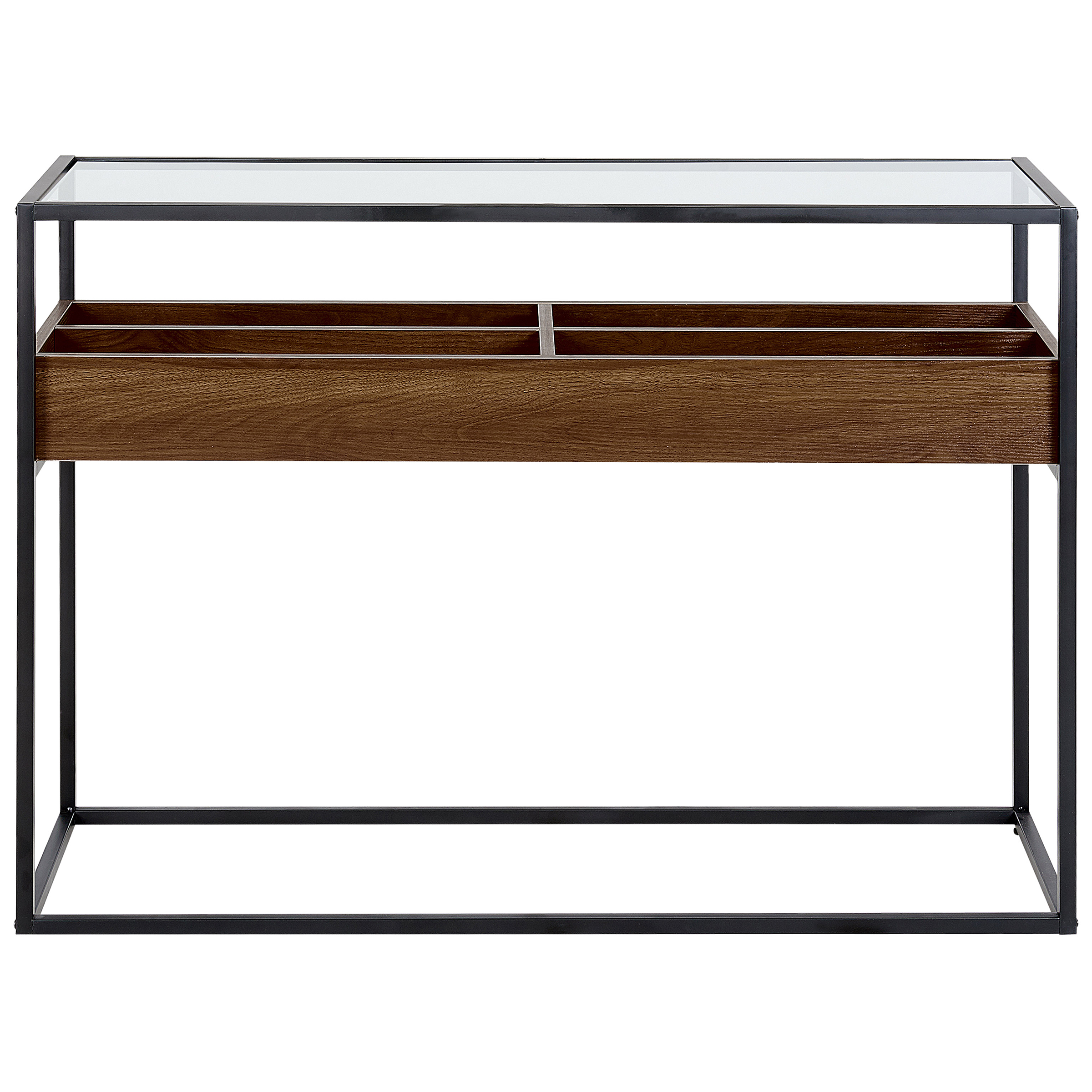Suorakulmainen konsolipöytä hyllyllä. Tämä suorakulmainen konsolipöytä on välttämätön lisä olohuoneisiin, joissa tarvitaan tilaa ja käytännöllisyyttä. Alaosan tyylikäs hylly on jaettu neljään osaan, joten voit järjestää sanomalehdet, kirjat ja muut tarpeelliset pikkutavarat omiin lokeroihinsa pitääksesi ne käden ulottuvilla. Karkaistusta lasista valmistettu pöytälevy ja vakaa metallirunko takaavat kestävyyden ja saavat konsolipöydän sopimaan useisiin sisustuksiin, etenkin moderneihin ja industriaalisiin.