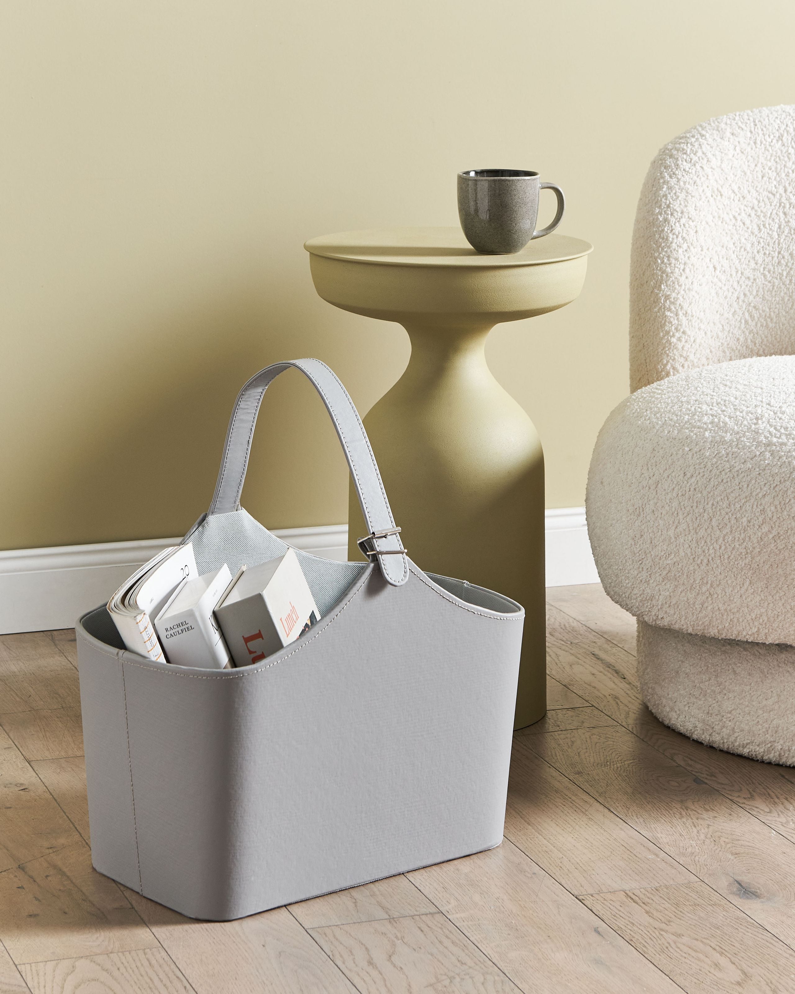 Käsintehty kori kahvalla. Täydennä kotiasi tällä tilavalla korilla, joka on sekä käytännöllinen että tyylikäs säilytysratkaisu. Se on valmistettu vankasta MDF-levystä ja verhoiltu kestävällä keinonahalla. Lisäksi korissa on tukeva kahva, mikä tekee sen kantamisesta ja siirtelystä helppoa. Kokonsa ansiosta se sopii erinomaisesti peittojen, lehtien tai muiden päivittäisten tavaroiden järjestyksessä pitämiseen ja säilyttämiseen. Muotoilunsa ja värinsä ansiosta se on helppo sulauttaa osaksi useita erilaisia sisustuksia.