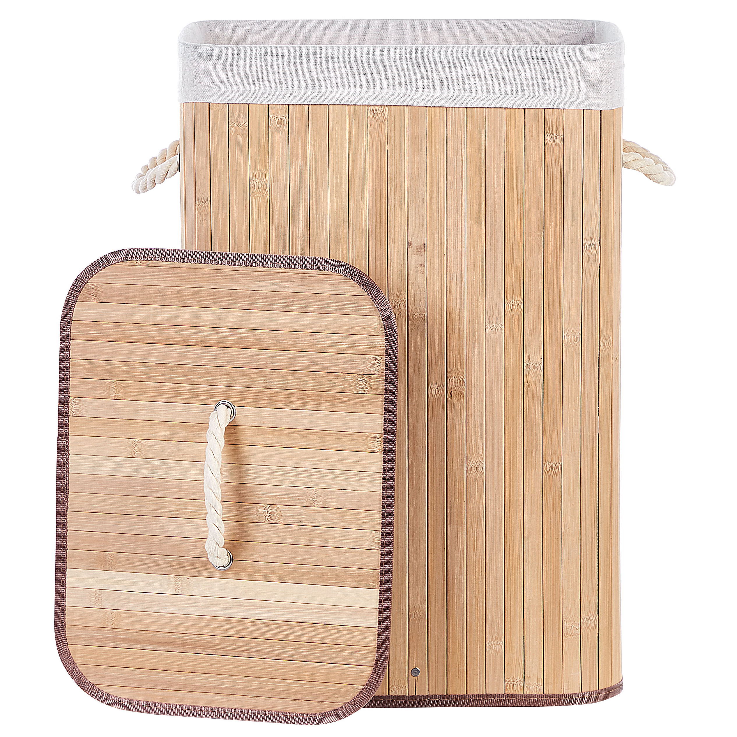 Kannellinen säilytyskori kylpy- tai olohuoneeseen. Tämä kompakti ja käytännöllinen kori auttaa pitämään kylpyhuoneen, makuuhuoneen tai olohuoneen järjestyksessä. Yksinkertaisesti mutta esteettisesti muotoiltu kori on valmistettu vankasta bambusta. Sisäpuoli on verhoiltu irrotettavalla ja pestävällä kankaalla, joka takaa hygieenisen käytön. Korin kannessa ja sivuilla olevat kahvat tekevät sen siirtelystä helppoa. Se tarjoaa sopivasti tilaa niin likavaatteille kuin tarpeellisille esineillekin.
