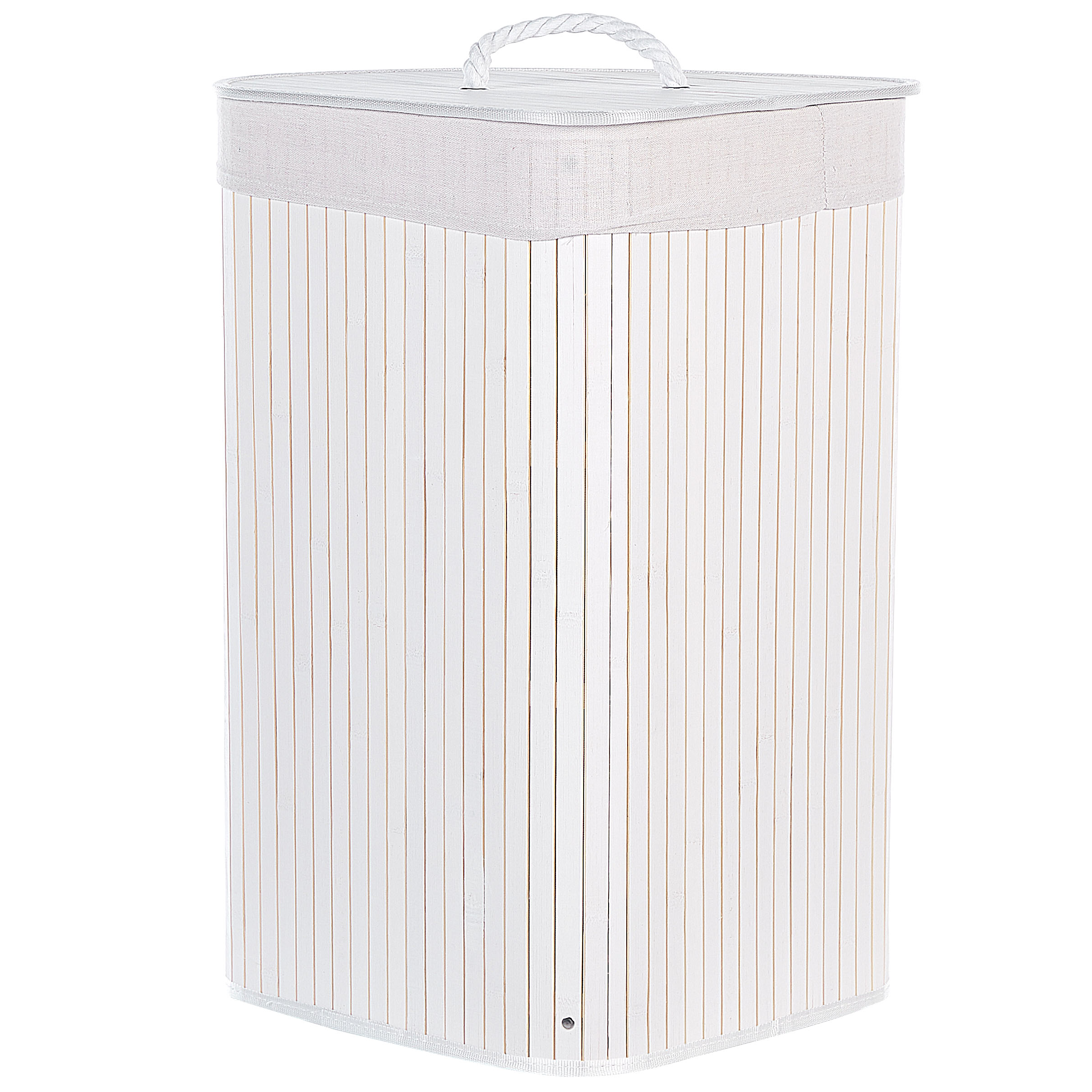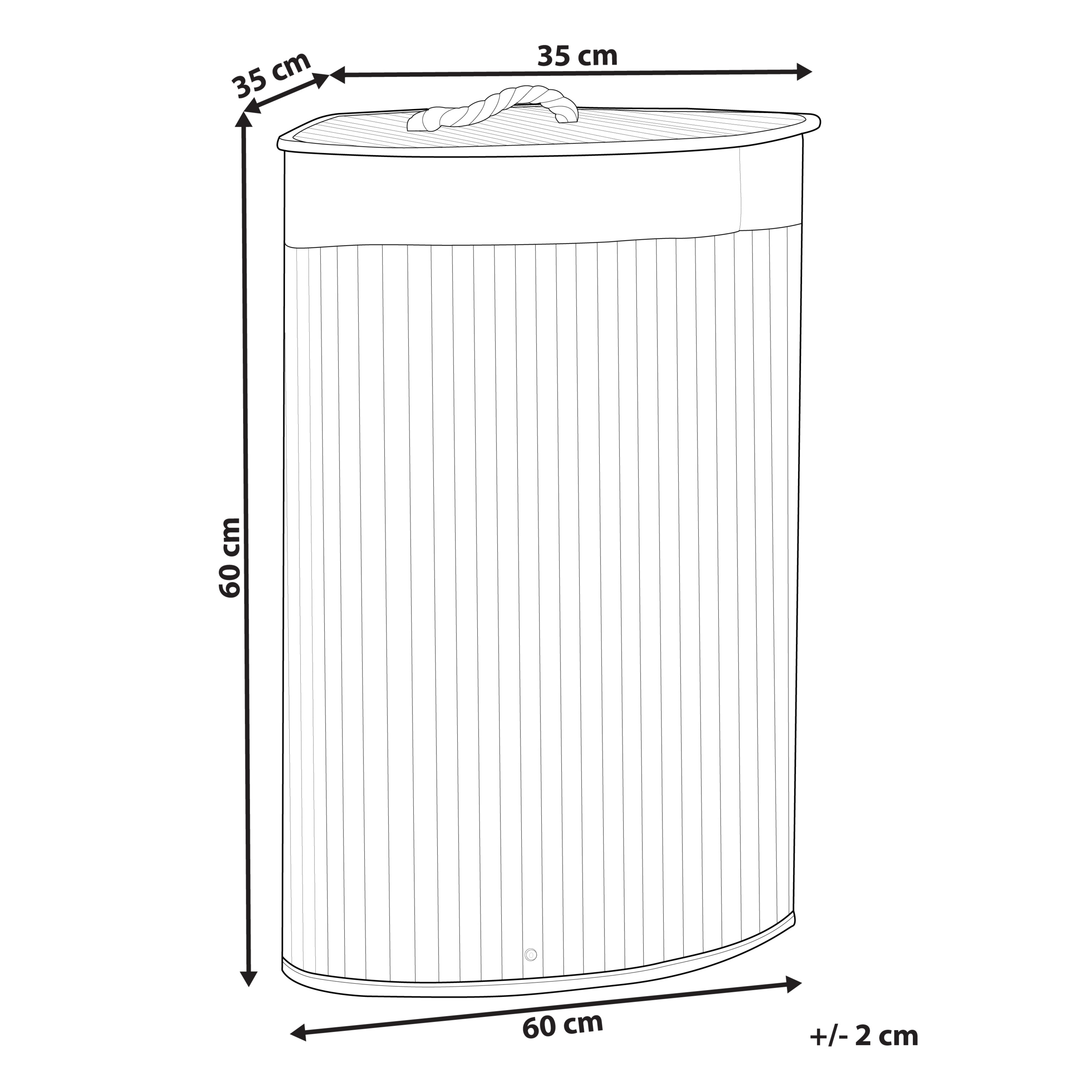 Pyykkikori irrotettavalla kannella. Tämä tilava säilytyskori on käytännöllinen lisä jokaiseen kotiin. Pidä koti siistinä sekä järjestyksessä ja käytä koria esimerkiksi pyykkikorina kylpyhuoneessa. Kori on valmistettu luonnollisesta bambusta, siinä on kätevä kahvallinen kansi ja se on vuorattu sisältä irrotettavalla yhteensopivalla kankaalla. Korin muoto on käytännöllinen, sillä se sopii täydellisesti nurkkaan ja siksi ei vie paljon tilaa.