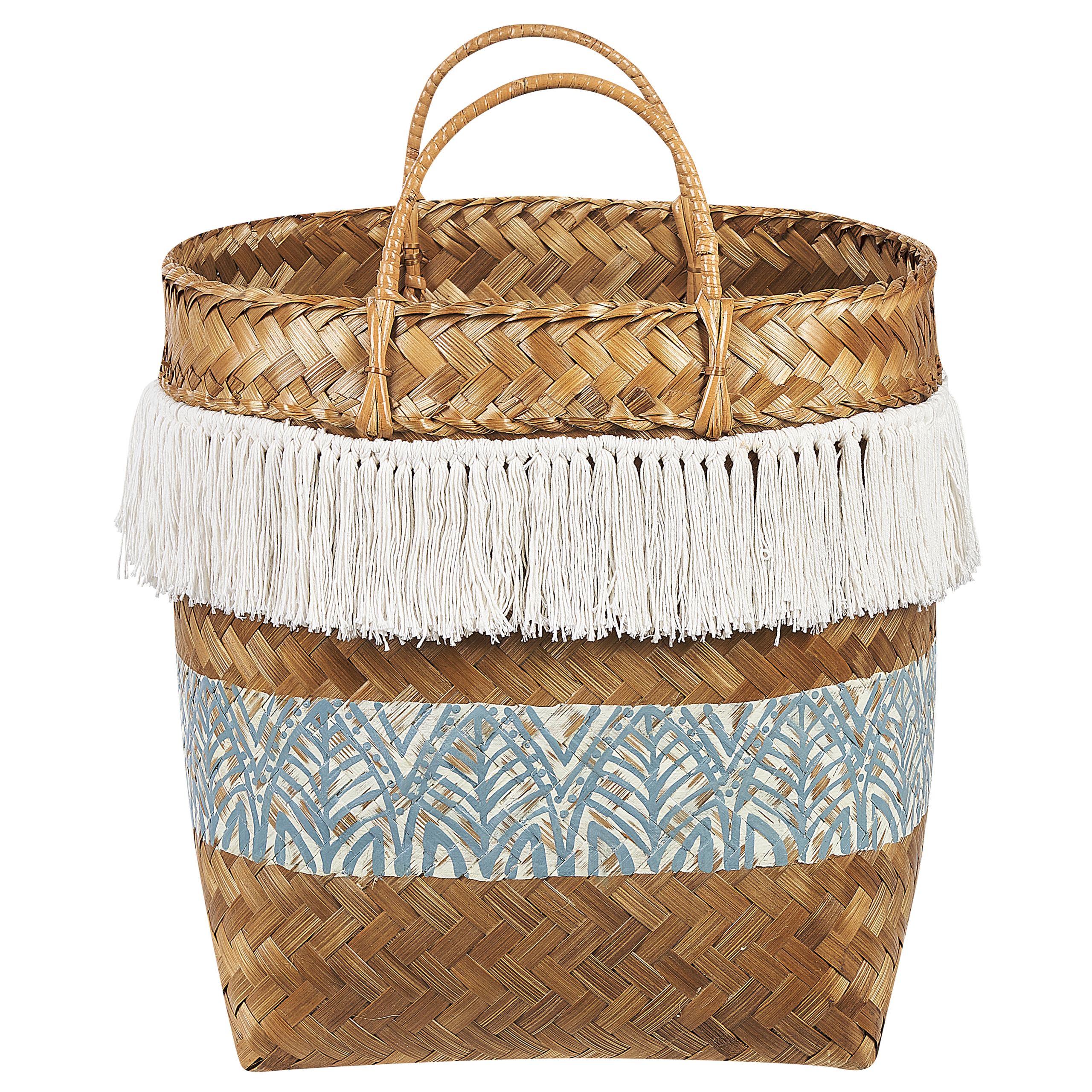 Boho-tyylinen kori kahvoilla. Tämä boho-tyylinen kori on täydellinen katseita keräävä koroste mihin tahansa tilaan. Se on valmistettu käsin luonnollisen sävyisestä bambusta, joten kori on kestävä ja helppohoitoinen. Kaunis, sinisen värinen abstraktikuvio ja valkoiset puuvillahapsut antavat korille erittäin koristeellisen ilmeen. Keveytensä ja käytännöllisten kahvojensa ansiosta koria on helppo siirtää paikasta toiseen. Aseta kori olohuoneeseen ja säilytä siinä erilaisia koristetyynyjä tai huopia.