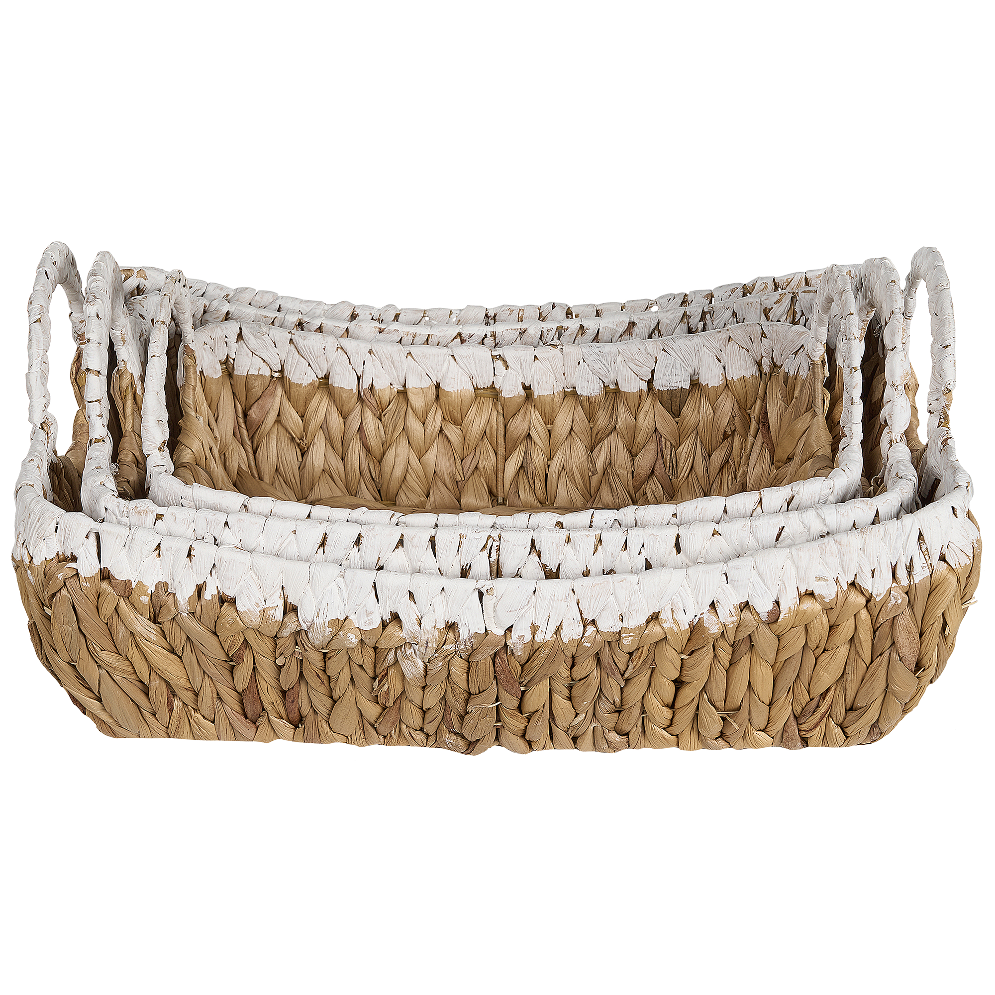 Käsin punottu korisetti kahvoilla. Tämä kolmen monipuolisen korin setti tarjoaa tyylikkään säilytysratkaisun. Ne sopivat erinomaisesti pienten tarpeellisten tavaroiden säilytykseen, täydentäen vaivattomasti hyllyjä ja luoden samalla viehättävän tunnelman mihin tahansa tilaan. Vesihyasintista käsin valmistetut korit ovat kestäviä ja elegantteja, ja niiden käytännöllinen muotoilu tuo kodin sisustukseen ihastuttavan lisän.