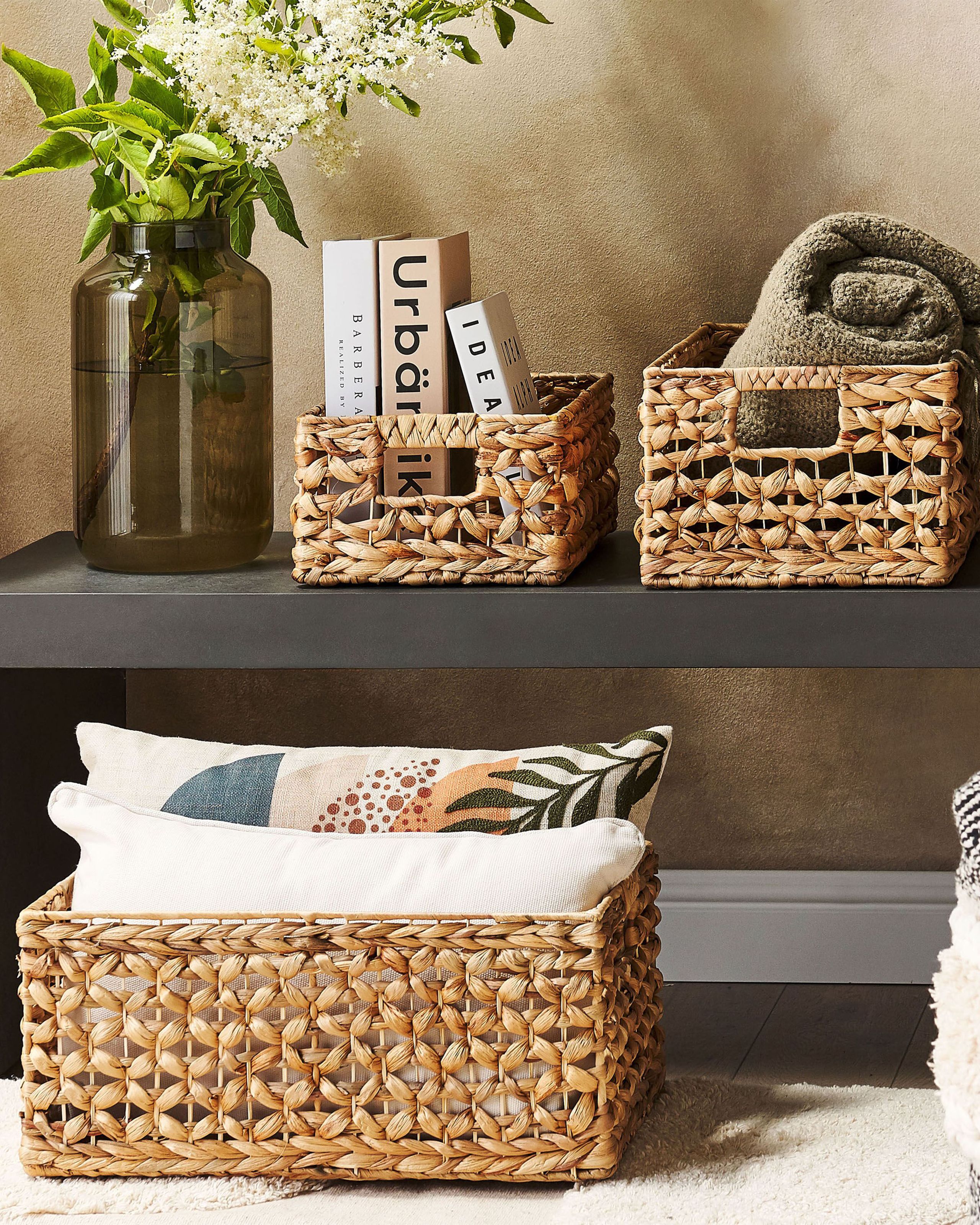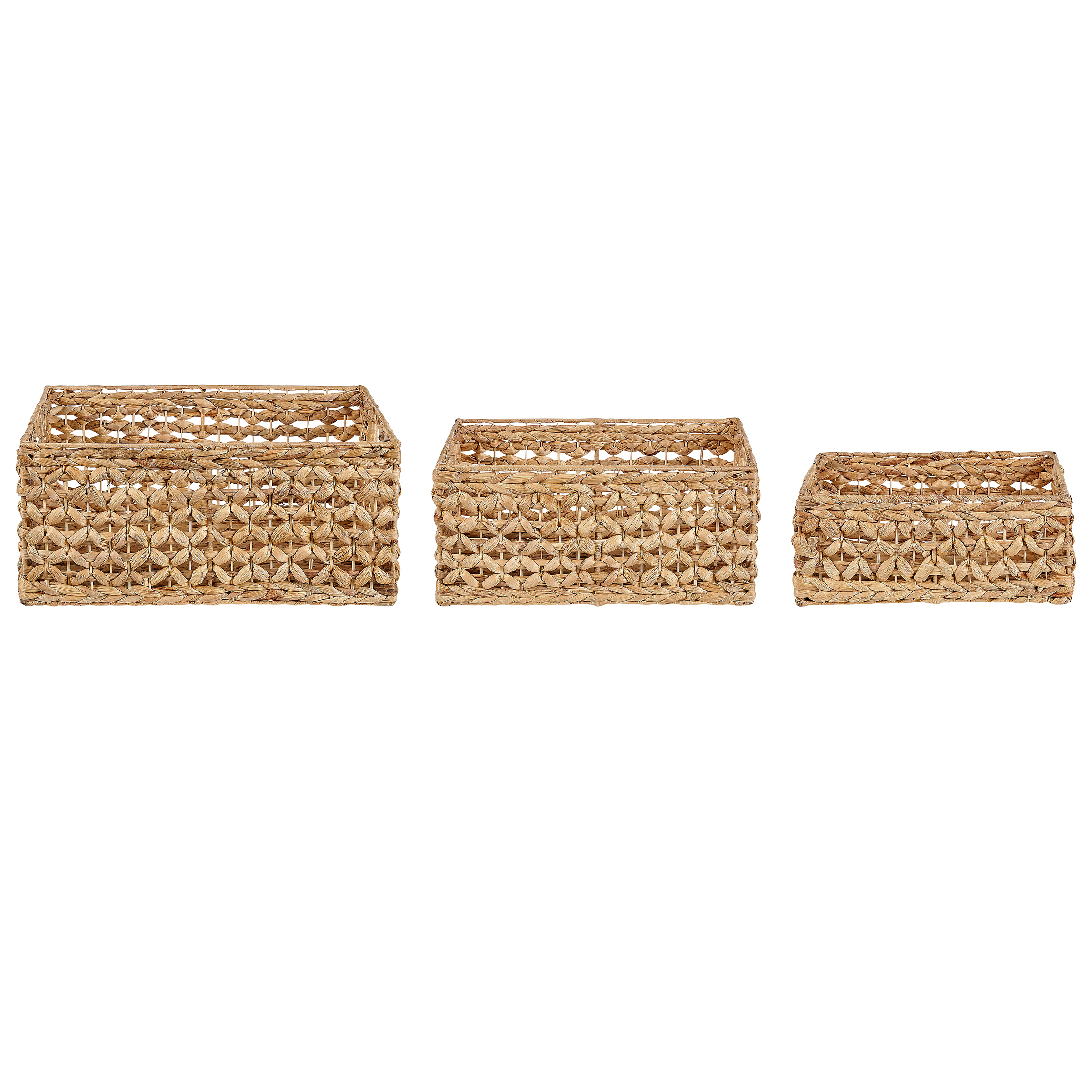 Käsin punottu korisetti. Tämä kolmen käsinpunotun korin setti on loistava säilytysratkaisu, joka sopii niin olo-, makuu, kuin kylpyhuoneeseen. Setin korit ovat kaikki erikokoisia, joten voit käyttää niitä monien eri tavaroiden säilyttämiseen, aina meikeistä leluihin ja peitoista kirjoihin. Voit sijoittaa ne hyllyille tai asettaa ne lattialle, sillä ne näyttävät hyvältä missä tahansa.