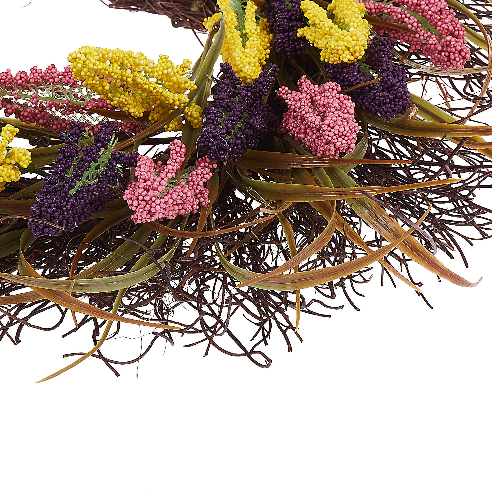 Koristeellinen ovikranssi kesäisillä tekokukilla. Tuo keväistä tunnelmaa kotiisi ja koristele tilasi tällä pyöreällä koristekranssilla. Luonnollisen näköisistä keinotekoisista heinistä sekä keltaisista, vaaleanpunaisista ja violeteista tekolupiineista valmistettu kranssi toimii näyttävänä ja koristeellisena aksenttina ympäri vuoden. Se on erittäin kevyt, ja sen voi ripustaa helposti seinälle tai oveen kätevän koukun ansiosta. Kranssi sopii erinomaisesti erityisesti perinteiseen, rustiikkiseen tai boho-tyyliseen sisustukseen, tuoden huoneeseen kodikasta tunnelmaa.