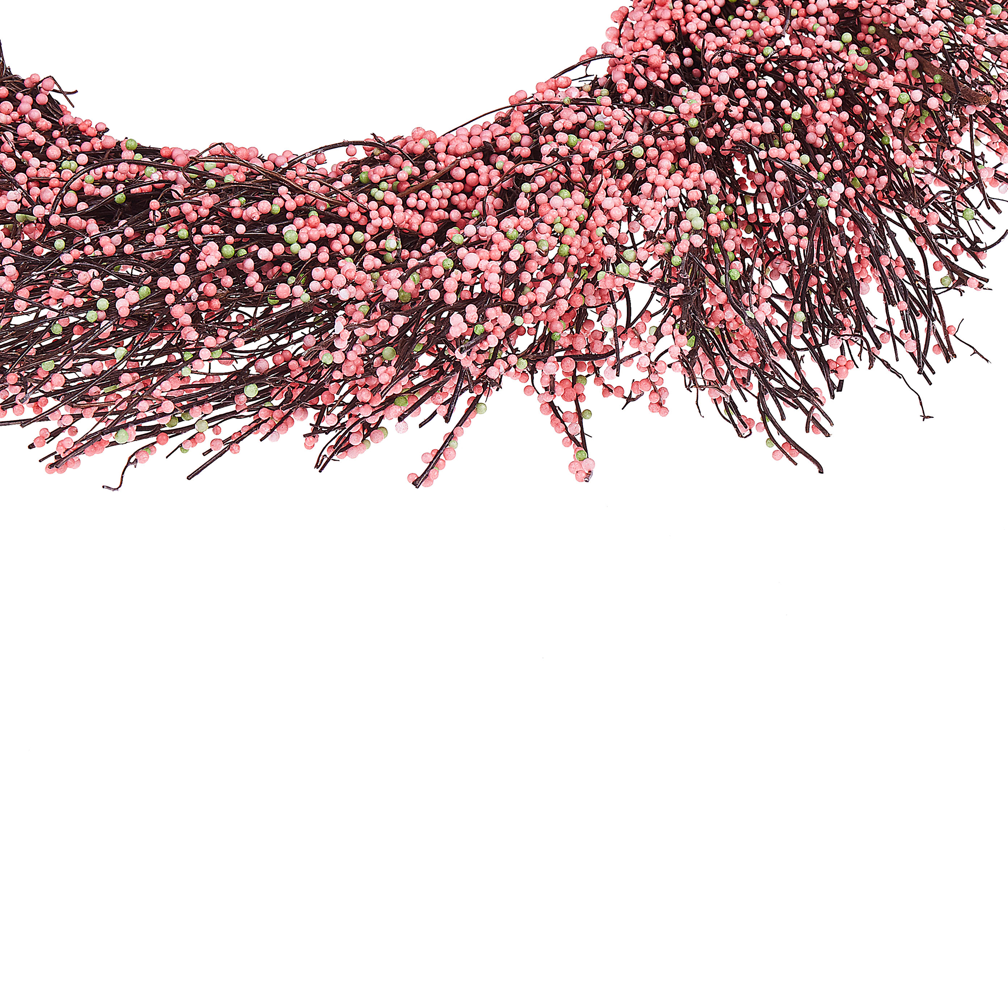 Koristeellinen ovikranssi. Tämä kevyt, käsintehty koristekranssi on täydellinen lisä boho-tyylisiin ja rustiikkisiin sisustuksiin, tuoden niihin romanttisen vivahteen. Tummanruskeita oksia koristavat hennon vaaleanpunaiset ja vihreät pienet pallot, jotka on valmistettu synteettisestä materiaalista. Kranssissa on myös käytännöllinen koukku, mikä tekee siitä helpon ripustaa oveen tai seinälle. Ihastuttavan värimaailmansa ja muotoilunsa ansiosta se toimii loistavana aksenttina mihin vuodenaikaan tahansa.