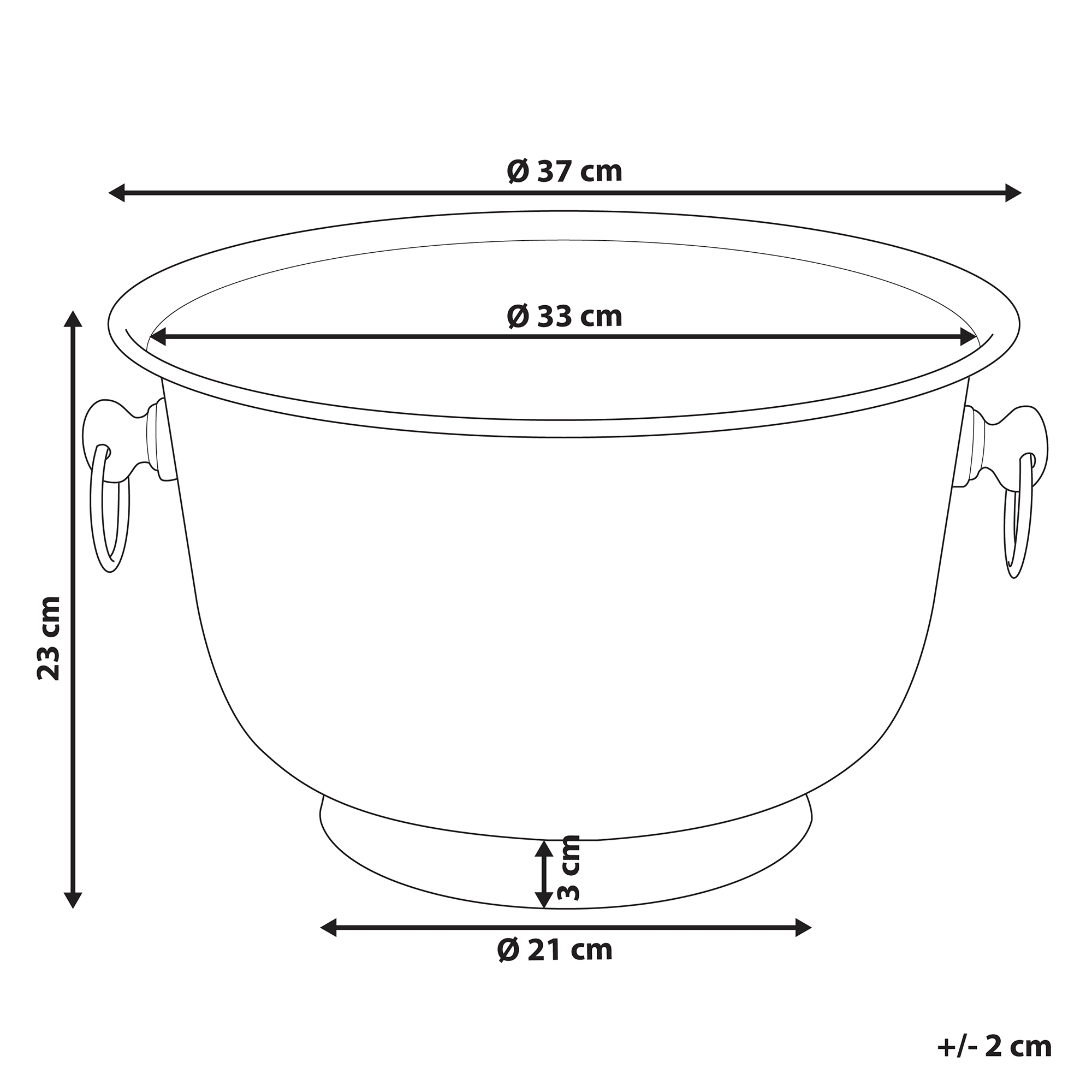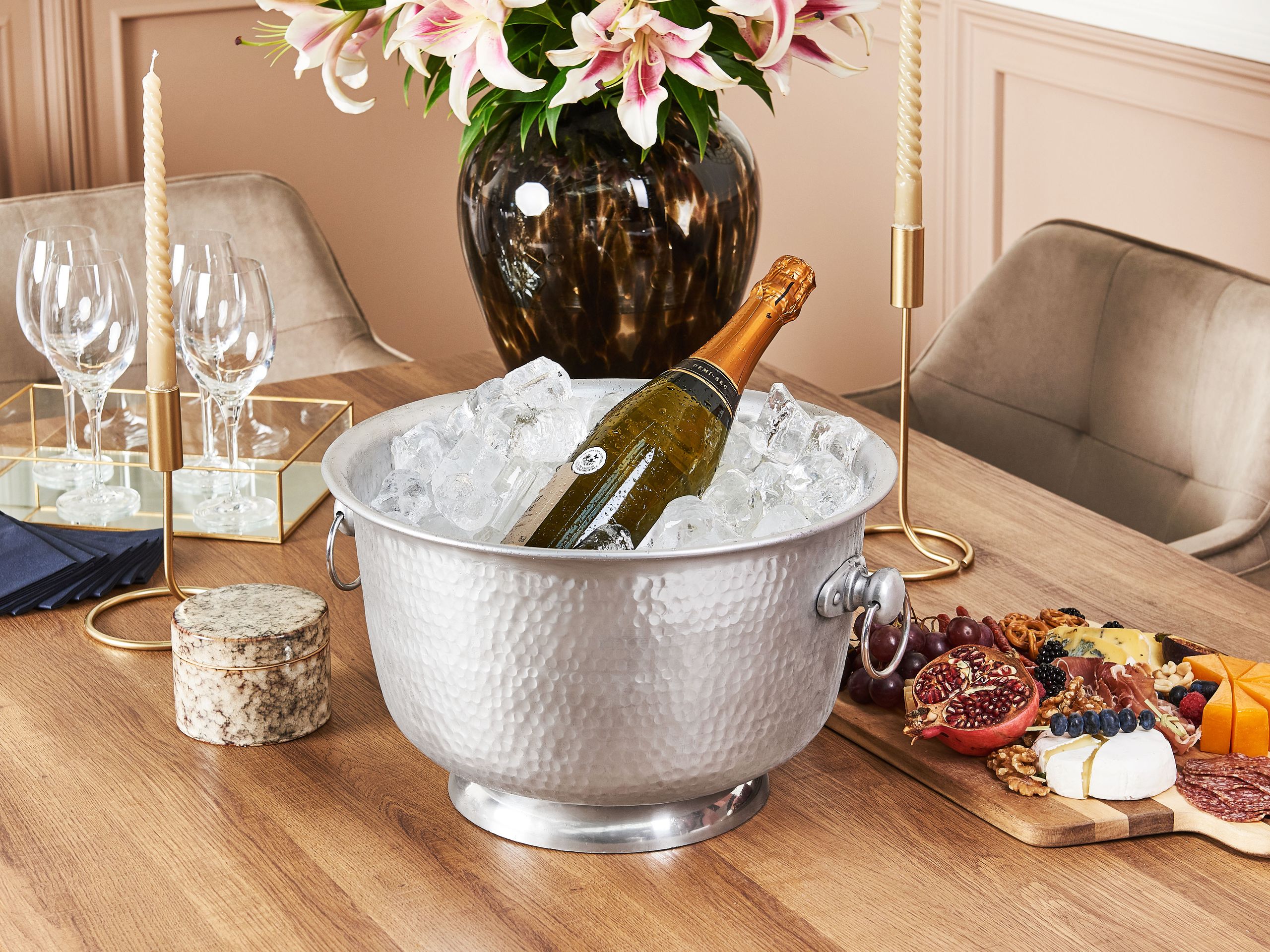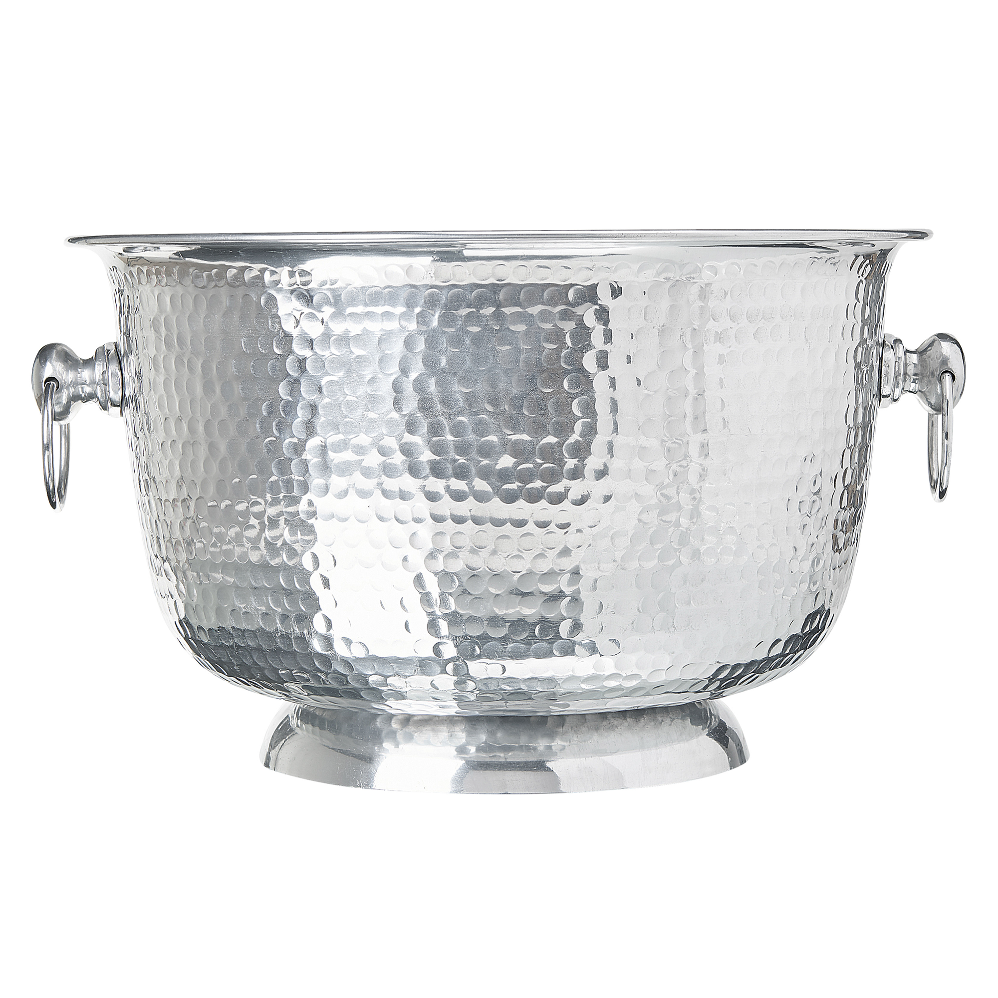 Koristeellinen juomajäähdytin kahvoilla. Tämä koristekulho on monikäyttöinen lisä, joka sopii erinomaisesti kaikkiin glamour-tyylisiin sisustuksiin. Elegantin muotoilunsa ansiosta sitä voidaan käyttää niin juomajäähdyttimenä juhlissa kuin myös pienten esineiden säilytyspaikkana eteisessä. Kulho on valmistettu käsin moukaroidusta kiiltävästä alumiinista, mikä tekee siitä kestävän ja ainutlaatuisen. Sivujen kahvat tekevät sen siirtelystä vaivatonta.