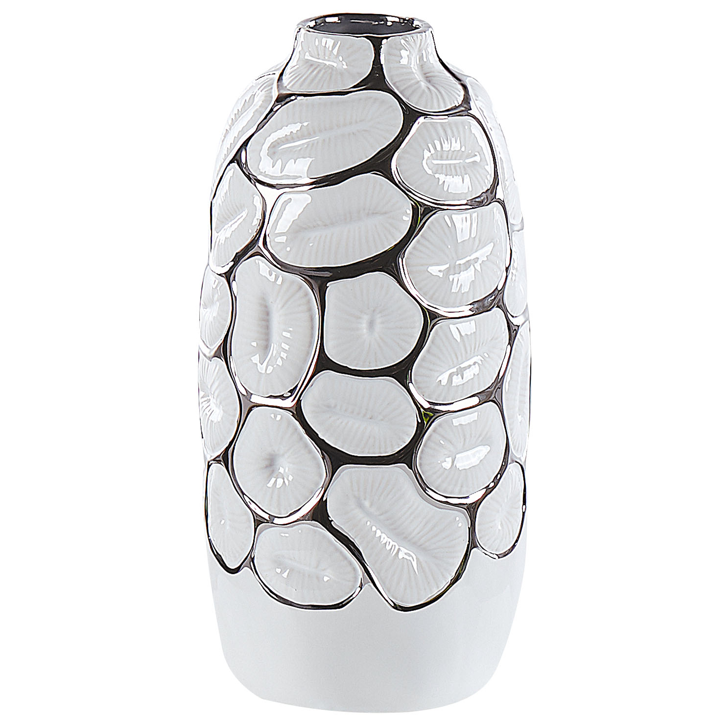 Moderni kohokuvioitu koristevaasi. Tämä upea maljakko on tyylikäs lisä mihin tahansa sisustukseen. Se on valmistettu kivitavarasta ja siinä on silmiinpistävä kohokuvioitu ulkopinta, jota on tehostettu hopeisilla yksityiskohdilla. Korkean muotonsa ansiosta se sopii täydellisesti koristekasvien esillepanoon.