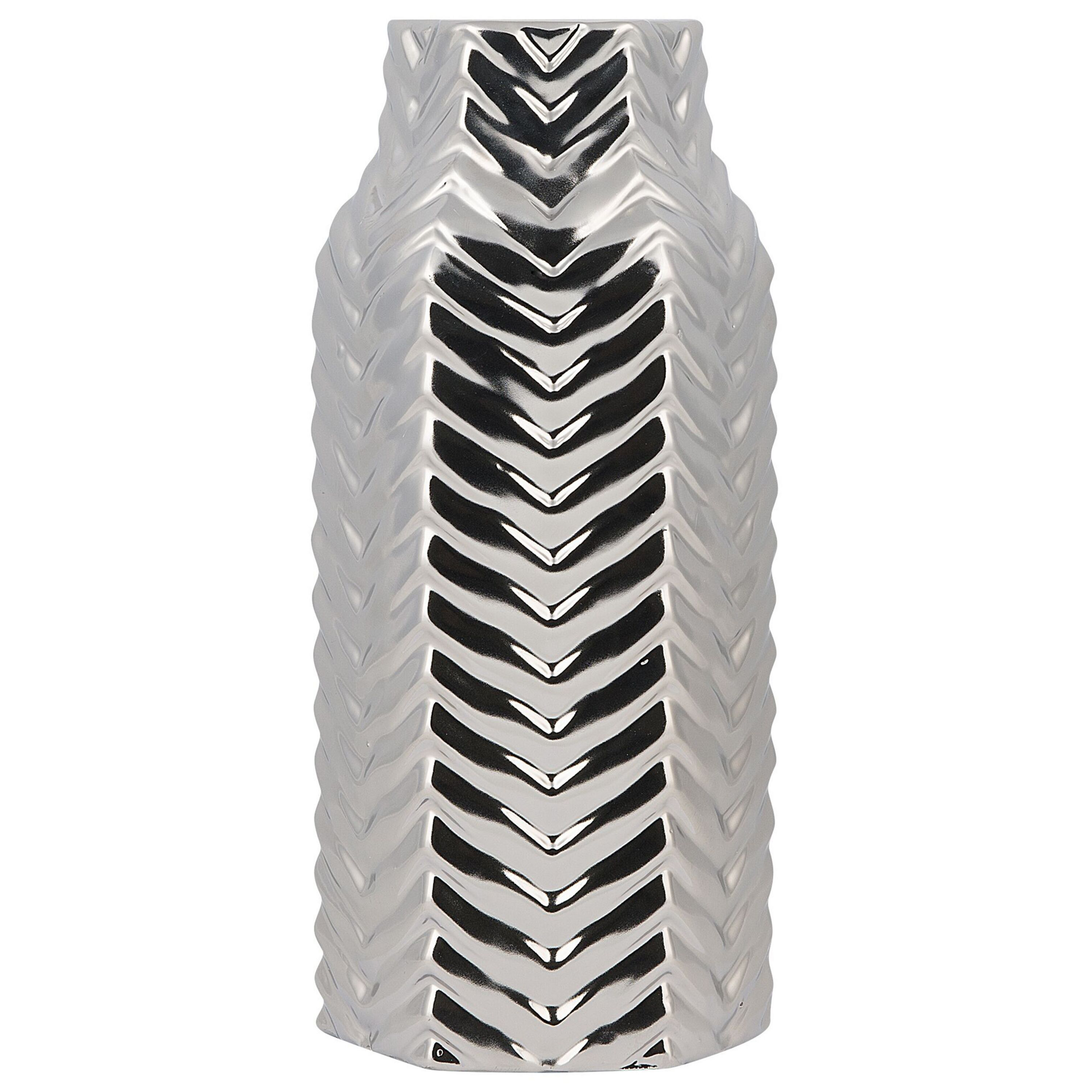 Glamour-tyylinen koristevaasi. Piristä mitä tahansa tilaa tällä koristemaljakolla, joka on valmistettu kestävästä kivitavarasta. Se sopii erinomaisesti sekä kuivakukkien että koristeoksien esillepanoon. Maljakon hopea väri ja uurrettu siksak-kuvio tuovat moderneihin ja perinteisiin sisustukseen tyylikästä särmää, olipa se asetettu pöydälle, ikkunalaudalle tai hyllylle.