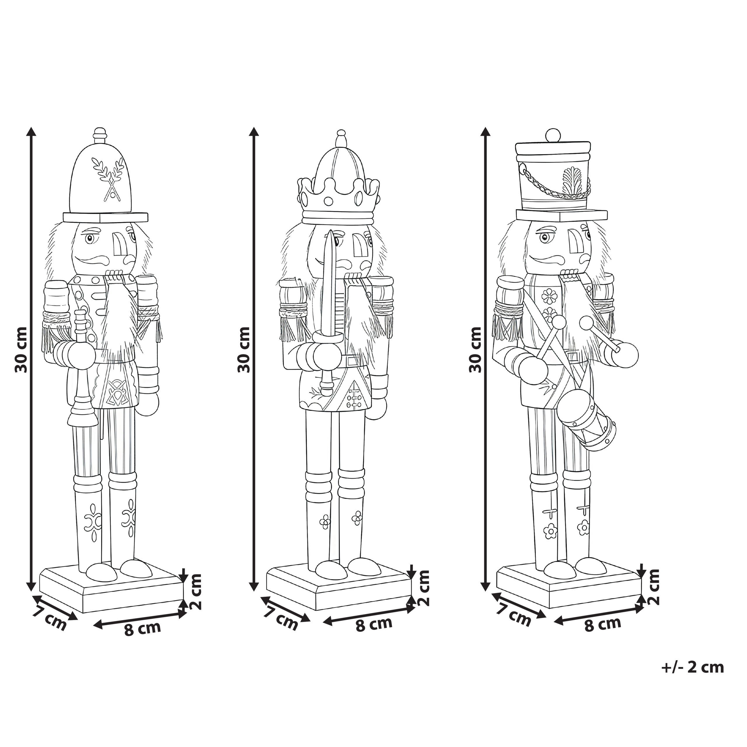 Perinteinen kolmen pähkinänsärkijän setti. Lisää kotiin ripaus joulun taikaa tällä kolmen kauniisti muotoillun pähkinänsärkijän setillä. Käsin männystä valmistetut, huolellisesti ja yksityiskohtaisesti viimeistellyt koristeet ovat ainutlaatuisia ja värikkäitä, minkä ansiosta ne tuovat joulun iloa mihin tahansa tilaan. MDF-jalustat varmistavat vakauden, olipa koristeet asetettu takanreunalle tai osaksi muita kauden koristeita.