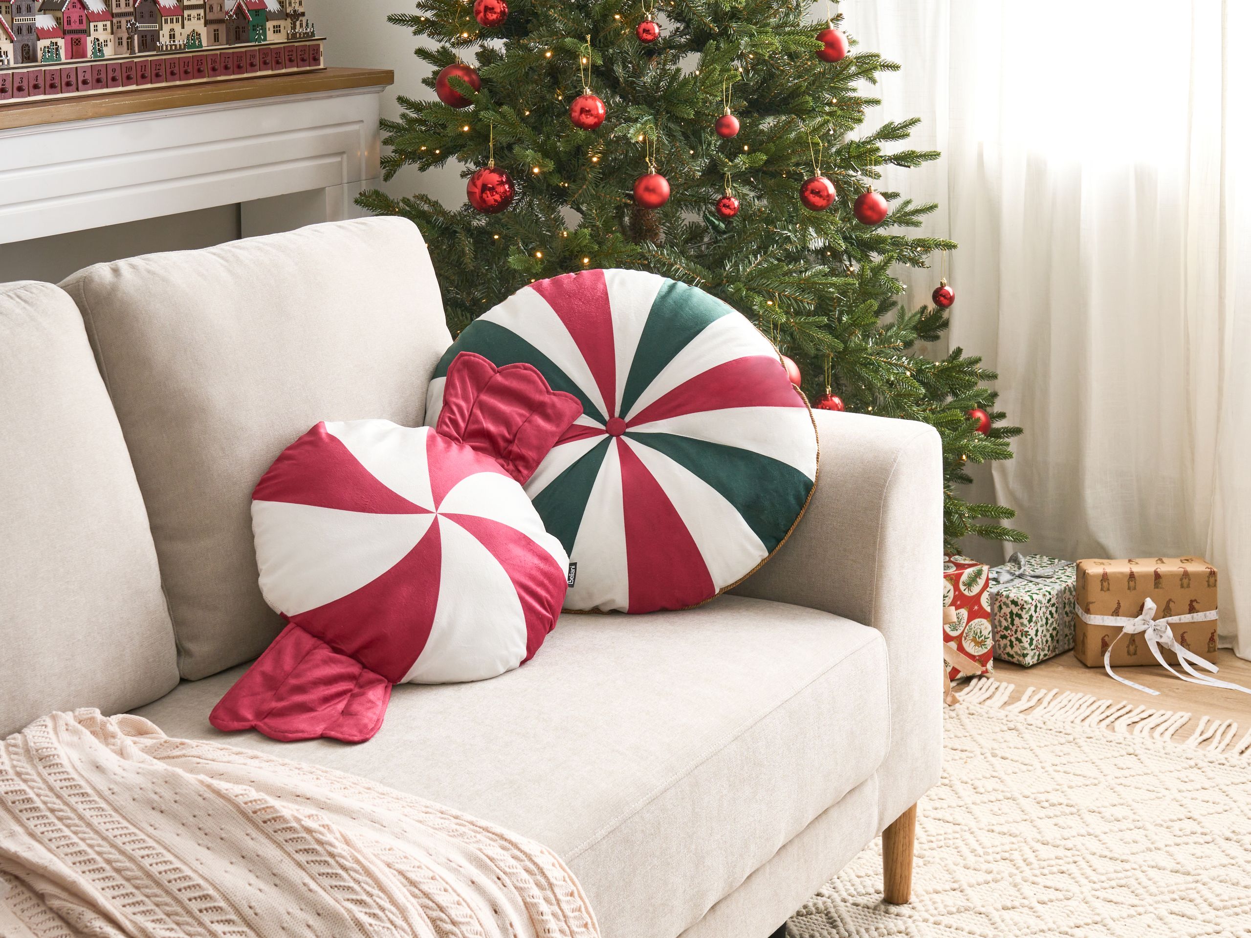 Polkkakarkkeja muistuttava joulutyynysetti. Tämä kahden jouluisen koristetyynyn setti on täydellinen tuomaan tilaan ripauksen väriä ja mukavuutta. Niiden viehättävä, polkkakarkkia muistuttava muotoilu tuo jokaiseen huoneeseen hauskan ja sesonkiin sopivan elementin, kun taas pehmeä samettikangas tekee niistä erinomaiset loikoiluun sohvalla kylmempinä kuukausina. Niistä tulee helposti joulusisustuksen suosikkikoriste.