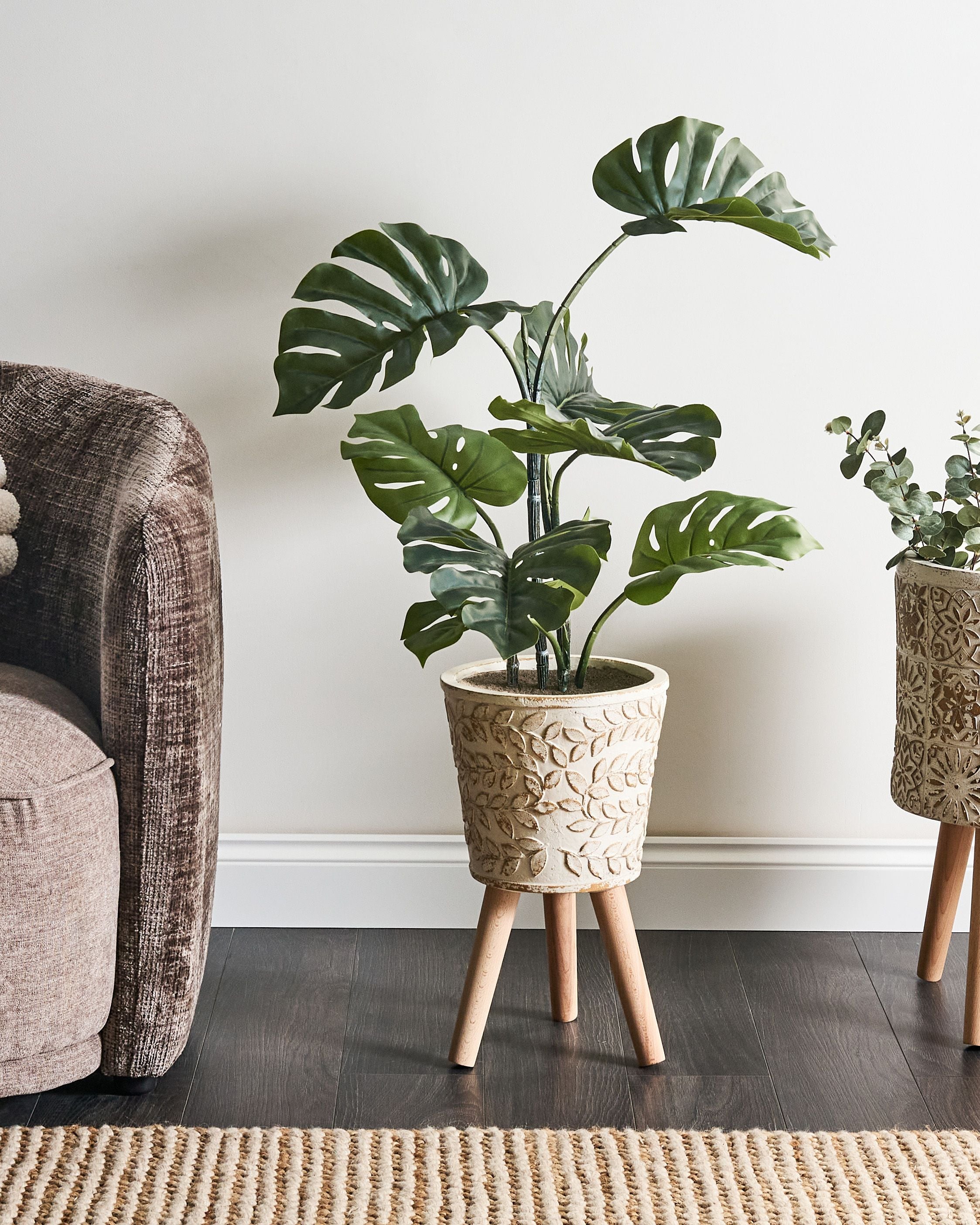 Rustiikkinen kohokuvioitu ruukku jaloilla. Päivitä puutarhaasi, parvekettasi tai olohuonettasi tällä tyylikkäällä kukkaruukulla, jonka tukevat vaaleat pyökkijalat antavat puhtaan, luonnollisen ilmeen. Kohokuvioitu kasvikuvio ja hienovaraisesti kulunut pinta lisäävät pehmeää, orgaanista viehätystä ja saavat ruukun sulautumaan kauniisti monenlaisiin sisustuksiin. Magnesiumoksidi takaa kestävyyden kosteutta, korkeita ja matalia lämpötiloja sekä UV-säteilyä vastaan. Se sopii erinomaisesti lisäämään ripauksen luonnetta joka tilaan, esitellen suosikkikasvejasi yksinkertaisella mutta elegantilla tavalla.