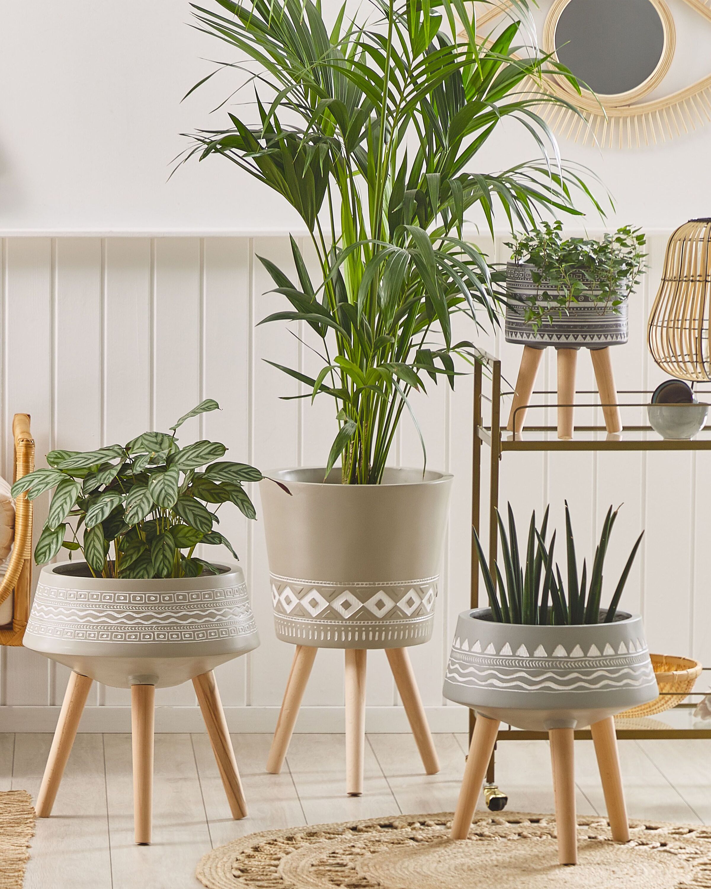 Pyöreä kukkaruukku puisilla jaloilla. Kaunis ruskea kukkaruukku antaa kasveillesi otollisen paikan kukoistaa. Ruukussa on näyttäviä geometrisia kuvioita, ja se sopii yhteen monenlaisten huonekalujen kanssa. Erityisen hyvin ruukku sopii retro- ja boho-tyylisiin asuntoihin.