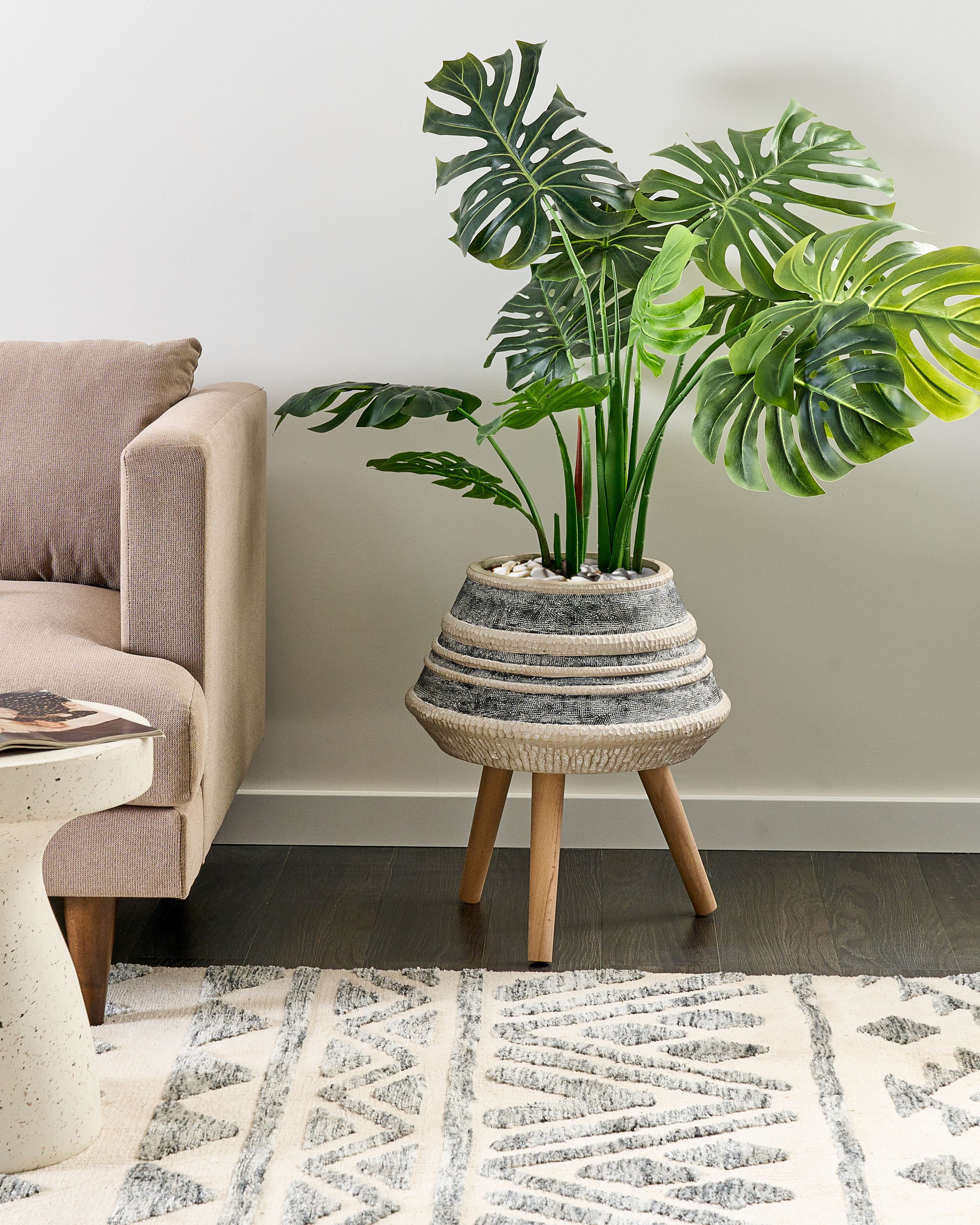 Raitakuvioitu kukkaruukku sisä- ja ulkokäyttöön. Tuo viehättävä sisustusaksentti kotiin tällä ainutlaatuisella käsin maalatulla kukkaruukulla. Vankat puujalat takaavat varman tuen, kun taas taidokas kuviointi ja harmoniset värit täydentävät kauniisti vehreää kasvillisuutta. Ruukku on valmistettu vedenkestävästä materiaalista ja suunniteltu kestämään pitkään, olipa se sijoitettu sisälle tai ulos. Tämä kukkaruukku on täydellinen valinta industriaalisiin ja boho-tyylisiin tiloihin.