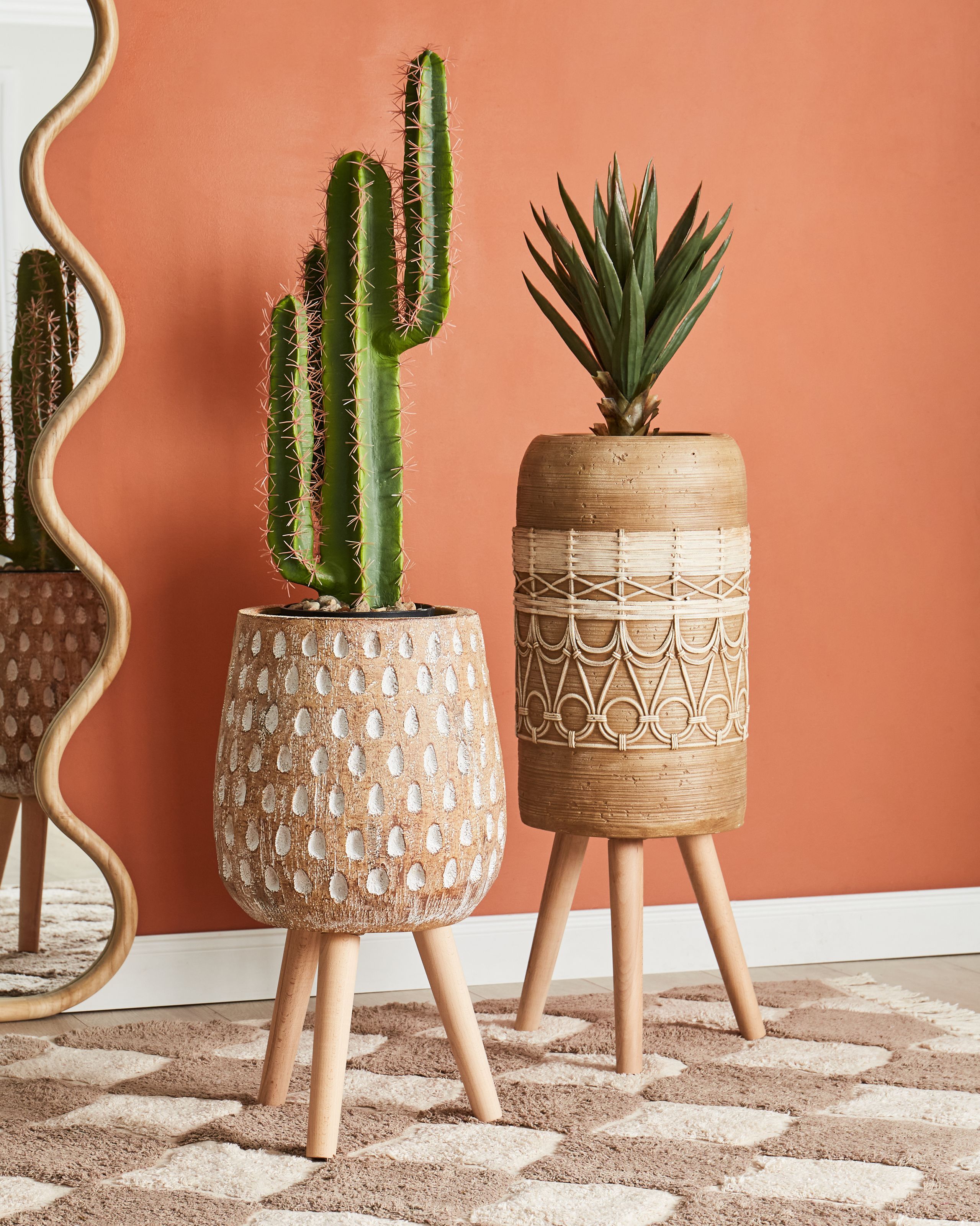 Retrohenkinen kukkaruukku. Tämä boho-tyylinen, käsinmaalattu kukkateline on koristeltu taidokkaalla kuvioinnilla pehmeän vaaleanruskean sävyssä. Vankat puujalat takaavat vakauden, ja vedenpitävän materiaalinsa ansiosta se sopii erinomaisesti sekä sisä- että ulkokäyttöön. Tämä kukkateline on täydellinen lisä olohuoneeseen tai puutarhaan ja täydentää tilaa kuin tilaa yhdessä lempikasviesi kanssa.