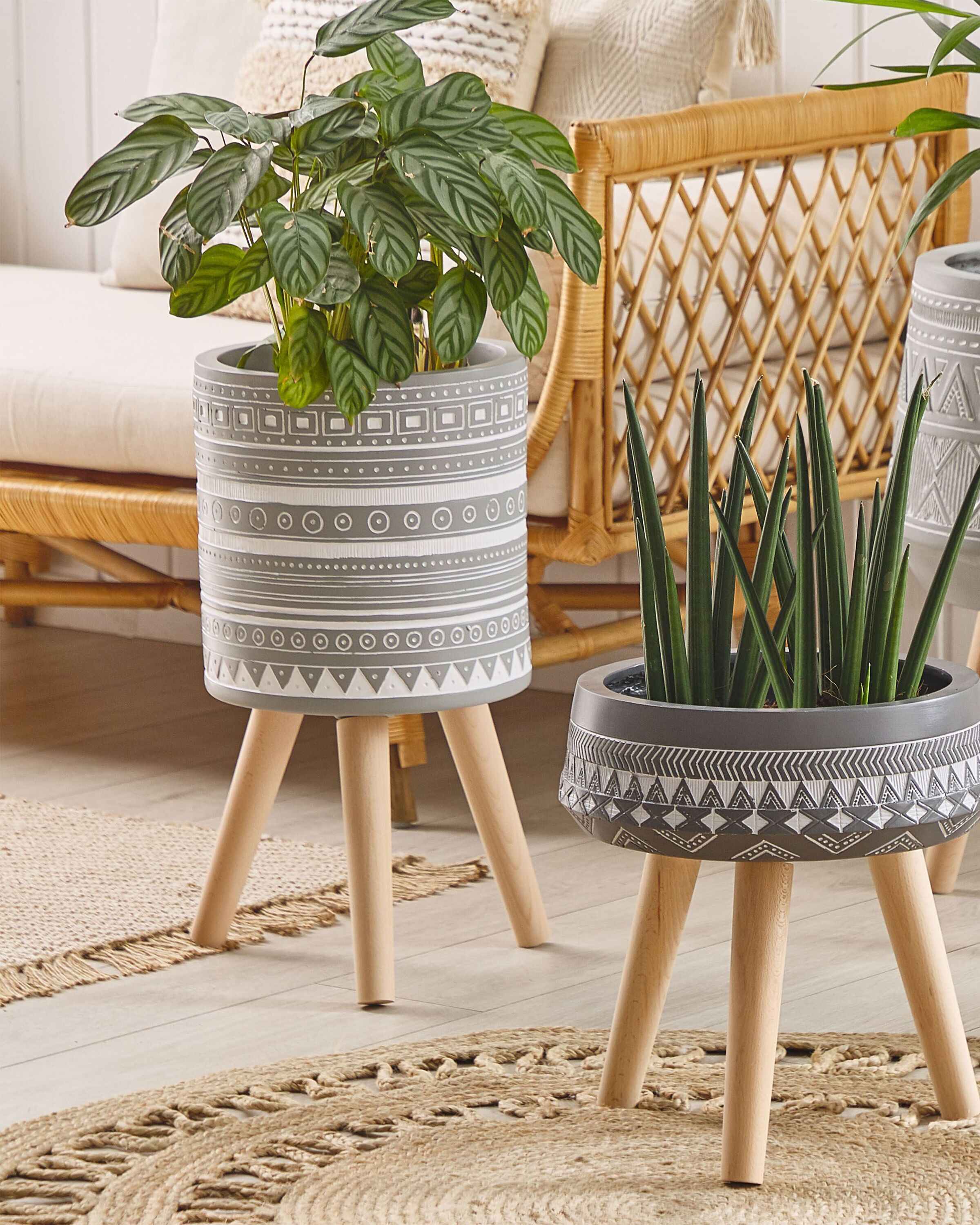 Koristeellinen kolmijalkainen kukkaruukku. Tämä kaunis kolmijalkainen kukkateline tuo boho-tyyliä mihin tahansa sisä- tai ulkotilaan. Ruukku on valmistettu säätä ja UV-säteilyä kestävistä materiaaleista, ja sen tukevat jalat ovat massiivipyökkiä. Käsinmaalattu ja kaiverrettu geometrinen kuvio sekä ajaton värimaailma tekevät siitä koristeen, joka sopii moniin sisustuksiin. Ruukun pohjassa on valmiiksi porattu tyhjennysreikä, joka varmistaa, että kasvisi ei saa liikaa vettä.