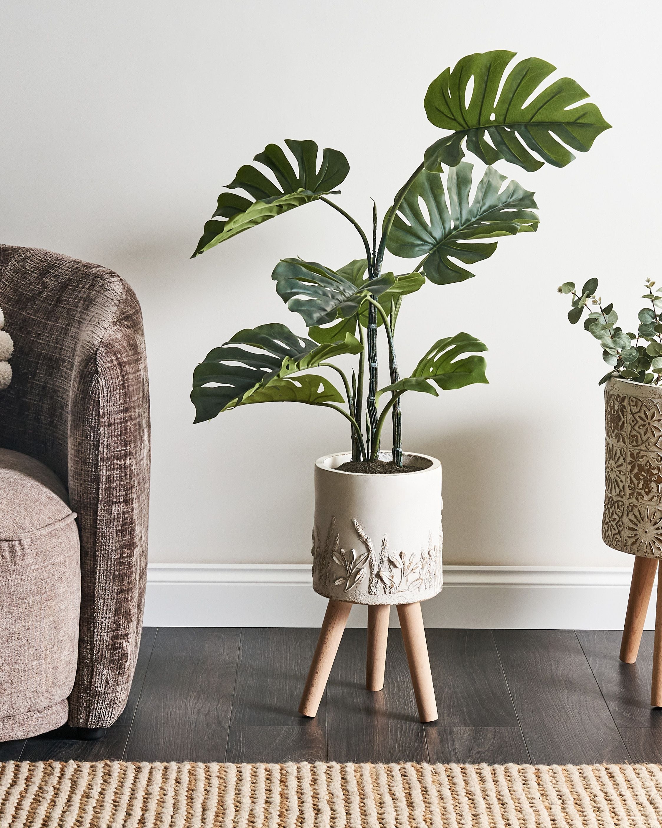 Jalallinen ruukku kohokasvikuviolla. Anna kukillesi tyylikäs koti tällä kauniilla kukkaruukulla, joka on yhtä näyttävä kuin käytännöllinen. Se on valmistettu kestävästä magnesiumoksidista ja asetettu eleganteille, vaaleille pyökkijaloille, joten se sopii erinomaisesti sekä sisä- että ulkokäyttöön. Käsintehdyt yksityiskohdat ja hienovarainen kohokasvikuvio tuovat ihastuttavan ja koristeellisen lisän, kohottaen viherkasvien ilmettä.