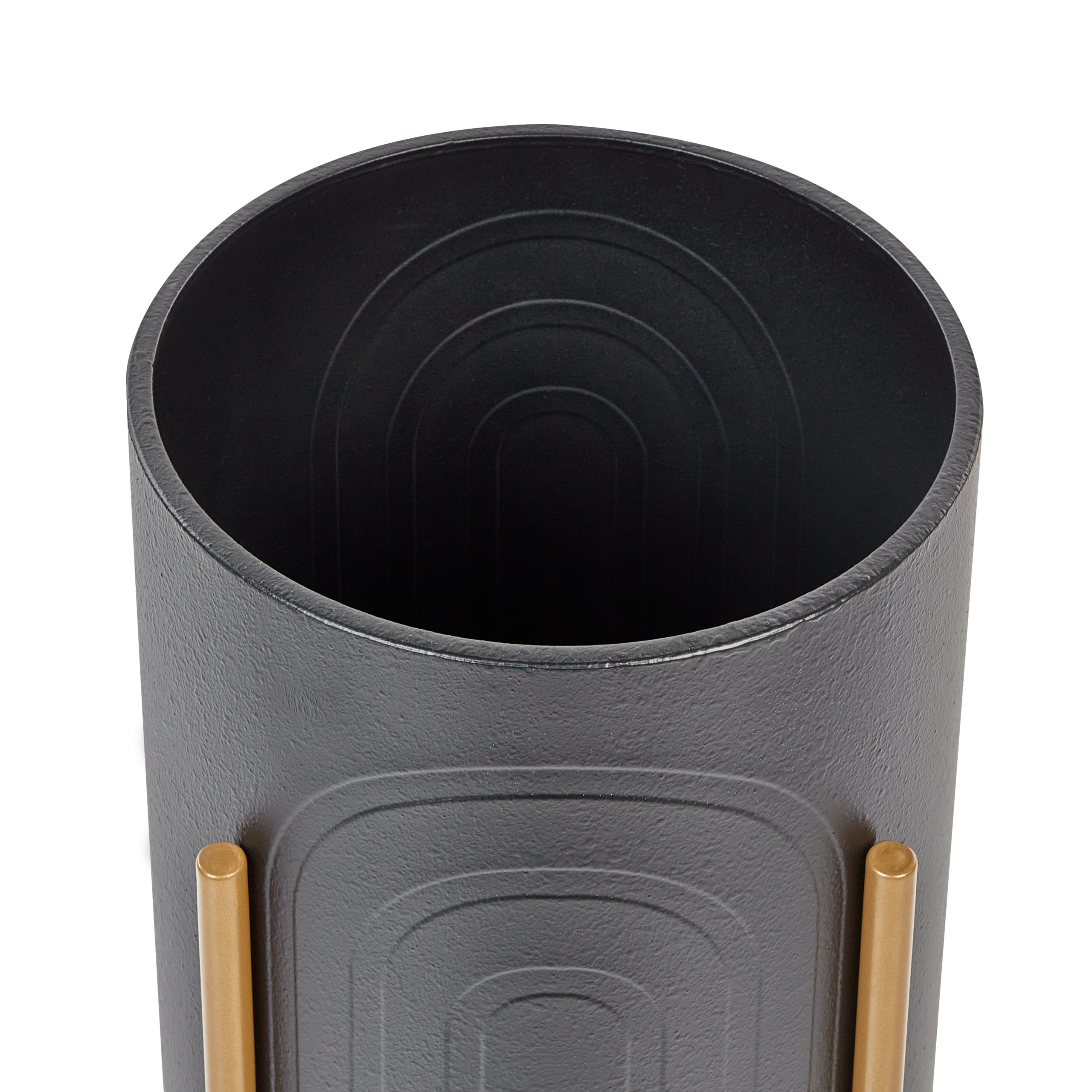 Pyöreä ruukku jalustalla. Tässä silmiinpistävässä mustassa ruukussa on kiehtova geometrinen kuvio, joka tuo sisätiloihin modernin särmän. Tyylikäs, kullanvärinen metallijalusta nostaa ruukun ilmettä ja luo ylellisen statement-kappaleen. Ruukku sopii täydellisesti suosikkikasvisi esillepanoon, ja siinä yhdistyvät nykyaikainen muotoilu ja ajaton tyylikkyys.