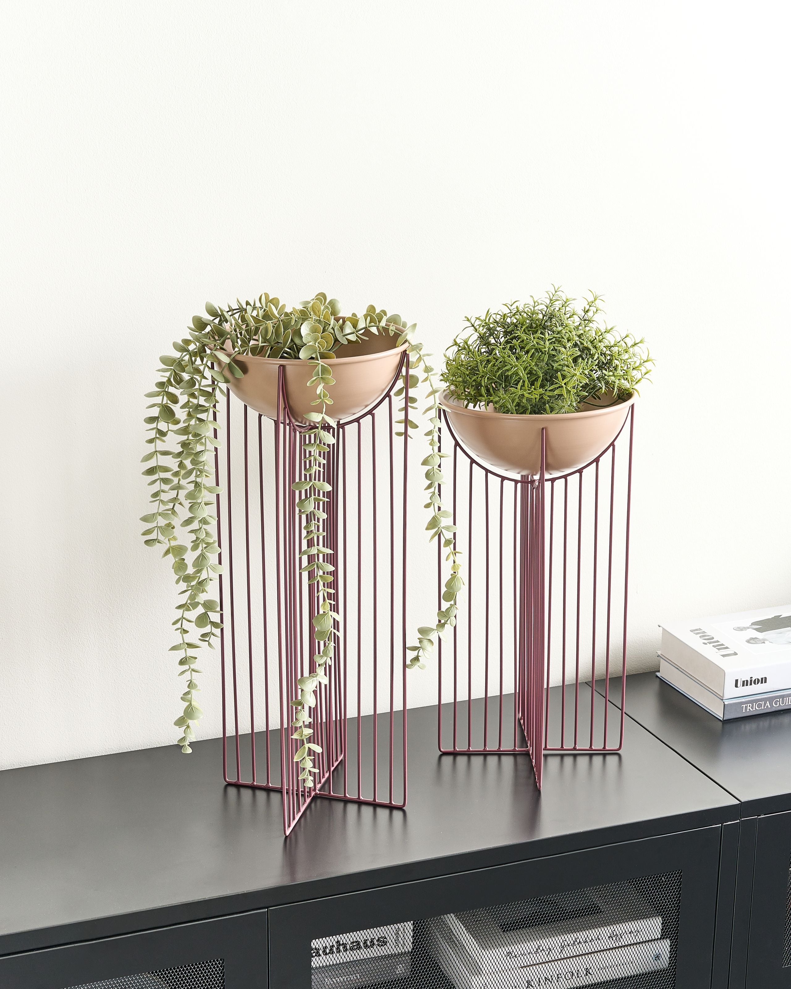 Koristeelliset kukkaruukut jalustalla. Tässä näyttävässä kahden kukkaruukun setissä yhdistyvät minimalistinen muotoilu ja uniikki geometrinen rakenne. Tyylikkäästi kaarevat ruukut istuvat vaaleanpunaisella värillä viimeistellyillä siroilla metallirungoilla, ja ne sopivat täydellisesti lisäämään ripauksen modernia eleganssia mihin tahansa tilaan. Asetellaanpa kukkatelineet sitten yhdessä tai erikseen, ne luovat näyttävän kokonaisuuden suosikkikasviesi kanssa. Tämä setti sopii erinomaisesti nykyaikaiseen sisustukseen, sillä se tuo tilaan sekä korkeutta että tyyliä, ja on erottuva lisä hyllyille tai eri pöytätasoille.