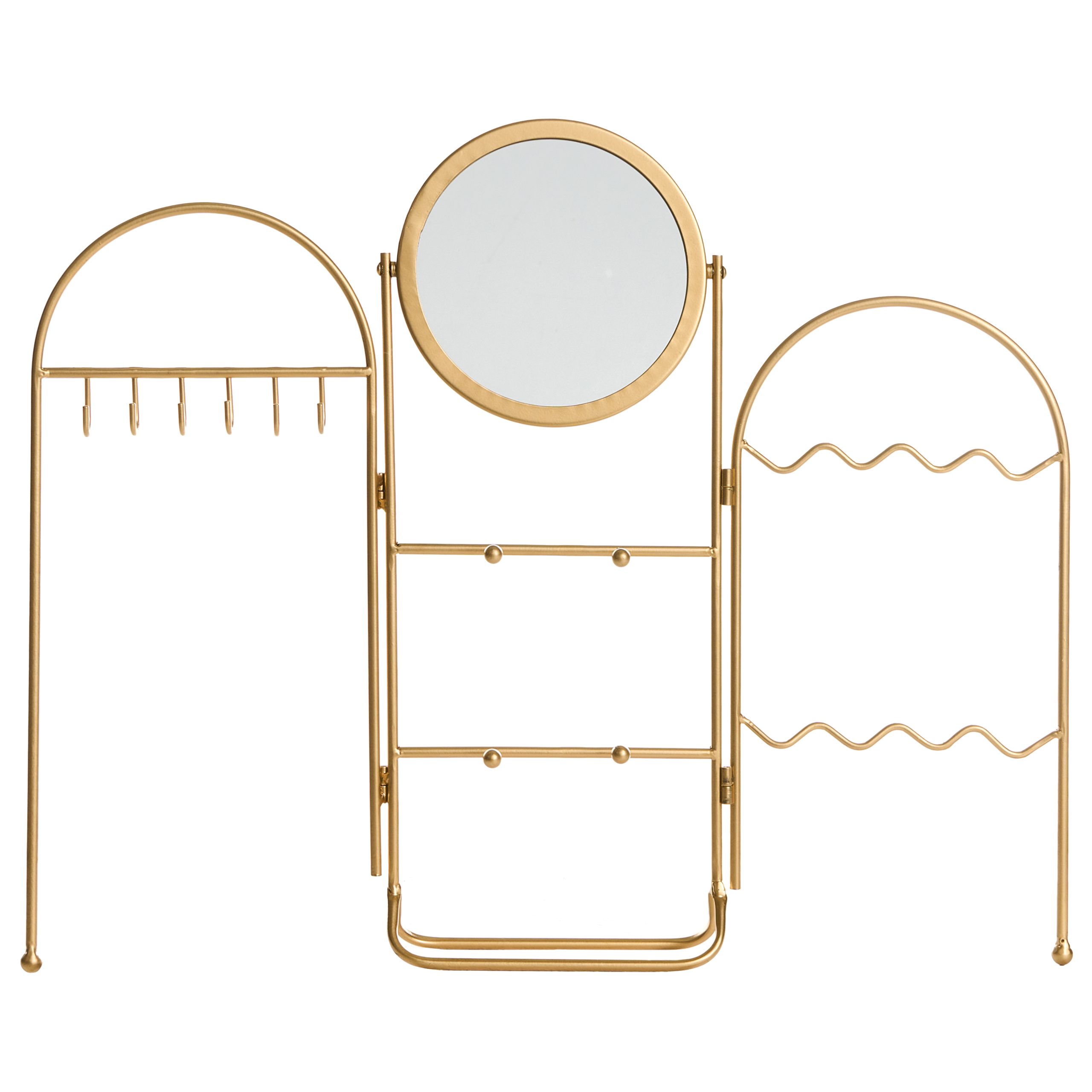 Gamour-tyylinen korupidike peilillä. Lisää tilaan ripaus glamouria tällä tyylikkäällä peilillä varustetulla korutelineellä. Sekä koristeelliseksi että toiminnalliseksi suunnitellussa korutelineessä on kätevät ripustimet suosikkikaulakoruillesi, riipuksille tai aurinkolaseille, kun taas peilin avulla voit heti tarkistaa ulkoasusi – täydellinen kappale, jolla voit kokeilla erilaisia yhdistelmiä käden käänteessä. Tyylikäs kullanvärinen metallikehys tekee siitä ihanteellisen sijoitettavaksi kampauspöydälle tai hyllylle, kohottaen makuuhuoneen tai vaatehuoneen sisustusta. Täydellinen paikka pitää muutama asuste käden ulottuvilla, mikä tekee aamulla laittautumisesta nopeampaa ja kätevämpää.