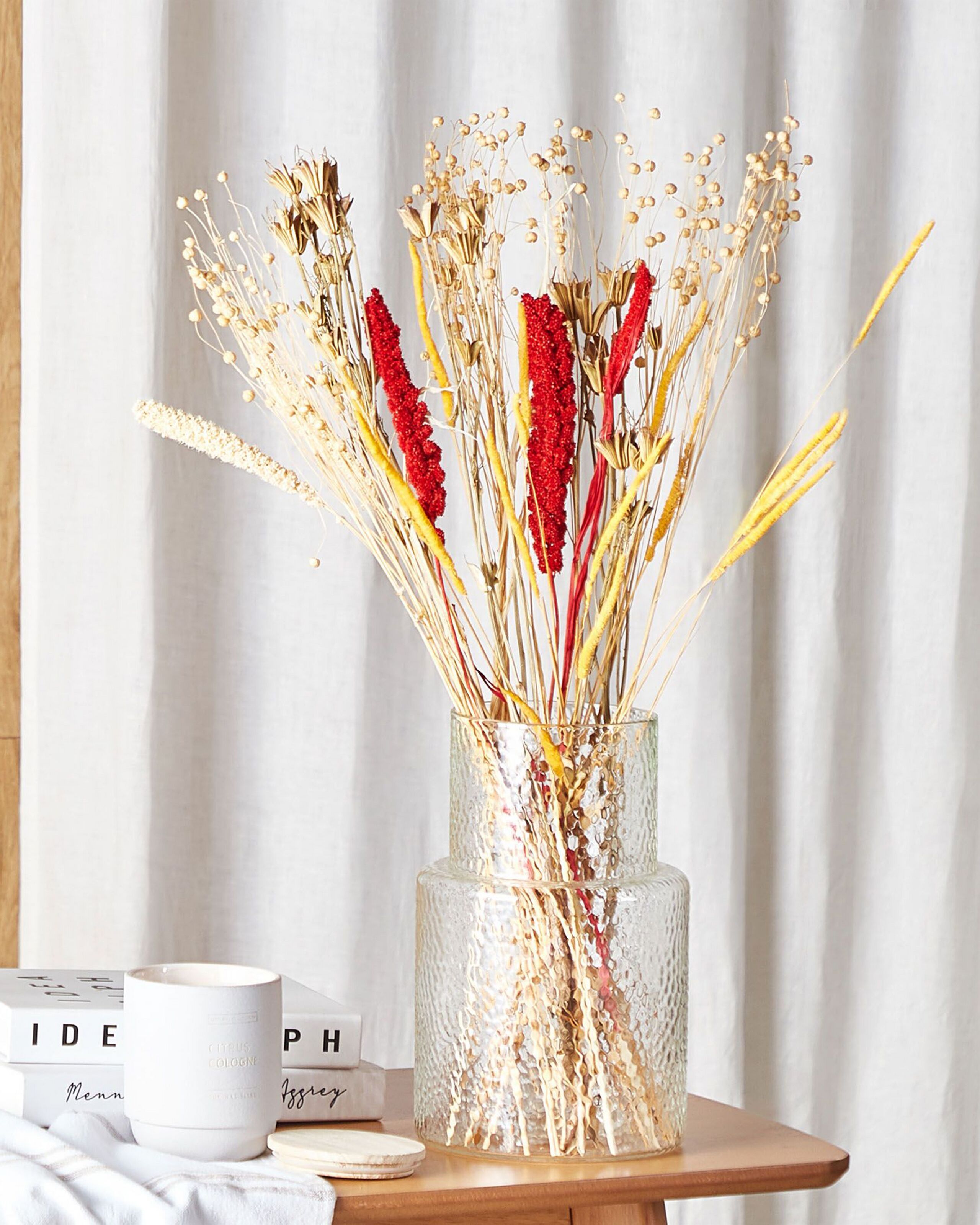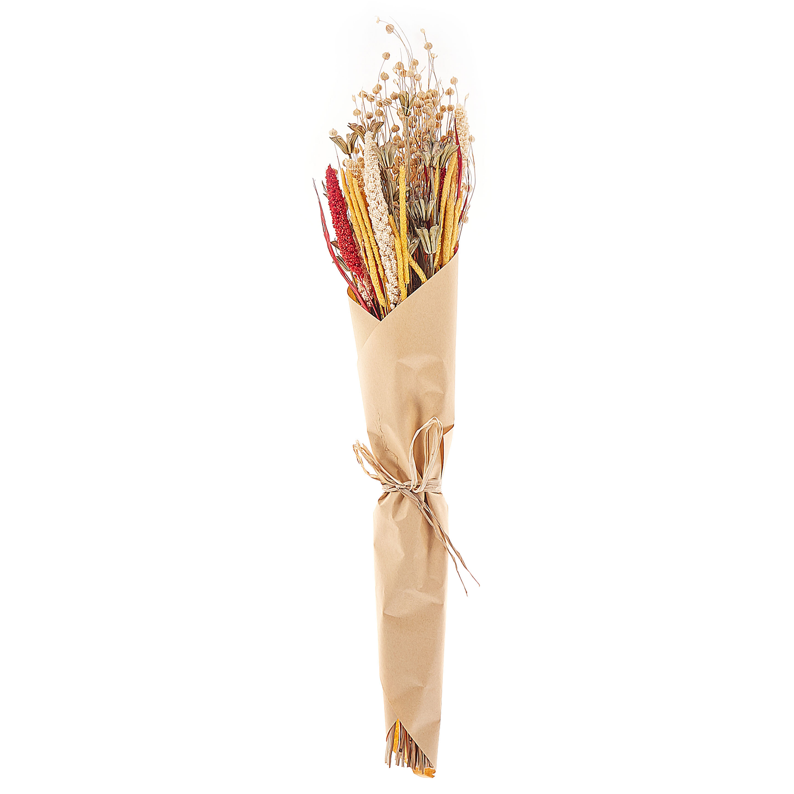 Koristeellinen kimppu kuivatuista kukista. Tuo rustiikkista tyyliä sisustukseesi tällä tyylikkäällä kuivakukkakimpulla. Se on valmistettu tarkasti valituista kasveista, jotka luovat harmonisen kokoelman. Aseta kimppu korkeaan maljakkoon luodaksesi persoonallisen ilmeen mihin tahansa tilaan. Kuivakukkakimppu on kääritty ruskeaan paperiin, joka on viimeistelty suloisella rusetilla.