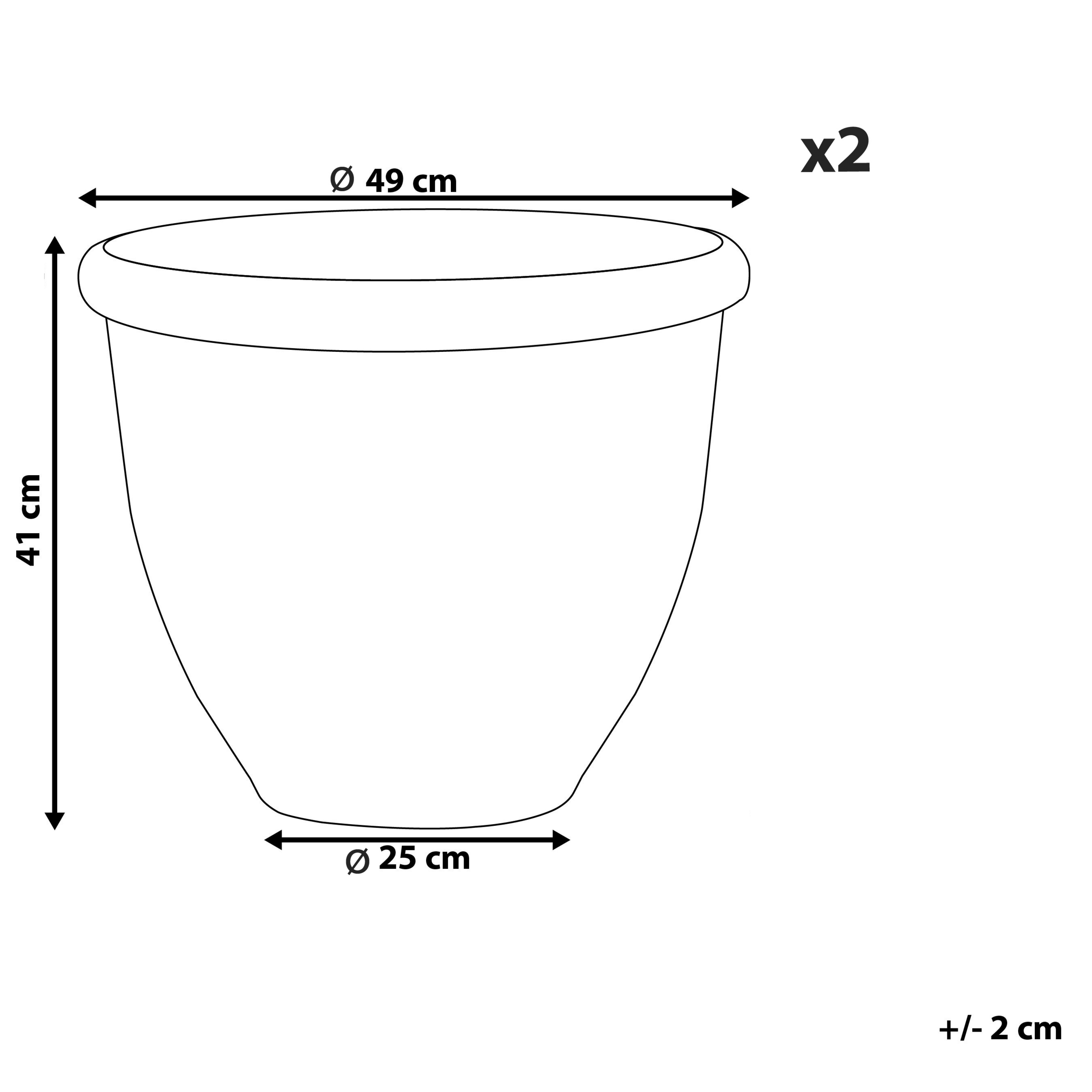Tyylikäs pyöreä ruukkusetti. Lisää kotiin, puutarhaan, terassille tai parvekkeelle perinteistä ilmettä tällä tyylikkäällä kahden kukkaruukun setillä. Klassinen pyöreä muoto ja kiiltävä viimeistely tekevät niistä näyttävän valinnan erilaisille kasveille. Ruukut on valmistettu polyhartsista, kivijauheesta ja lasikuidusta, minkä ansiosta ne kestävät sekä matalia että korkeita lämpötiloja, kosteutta ja UV-säteilyä. Pohjissa on esiporatut tyhjennysreiät, jotka varmistavat, ettei kasveja kastella liikaa. Neutraali sävy sulautuu vaivattomasti useisiin sisustustyyleihin.