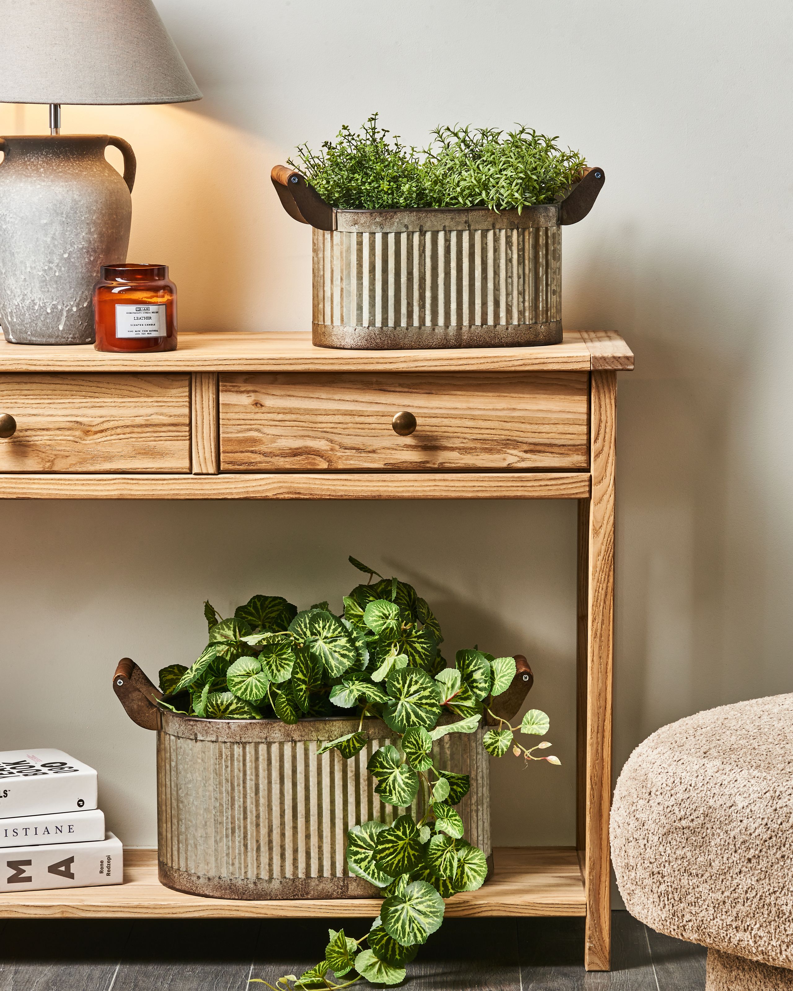Industriaalinen ruukkusetti sisä- ja ulkokäyttöön. Tämä kahden kukkaruukun setti yhdistää täydellisesti industriaalisen lujuuden ja luonnollisen viehätyksen. Erikokoisissa ruukuissa on tukevat puukahvat helppoa liikuttelua varten ja käsittelemätön, teksturoitu viimeistely. Ne sopivat erinomaisesti sekä sisä- että ulkokäyttöön, tarjoten kasveille kestävän kodin ja täydentäen monia sisustustyylejä.