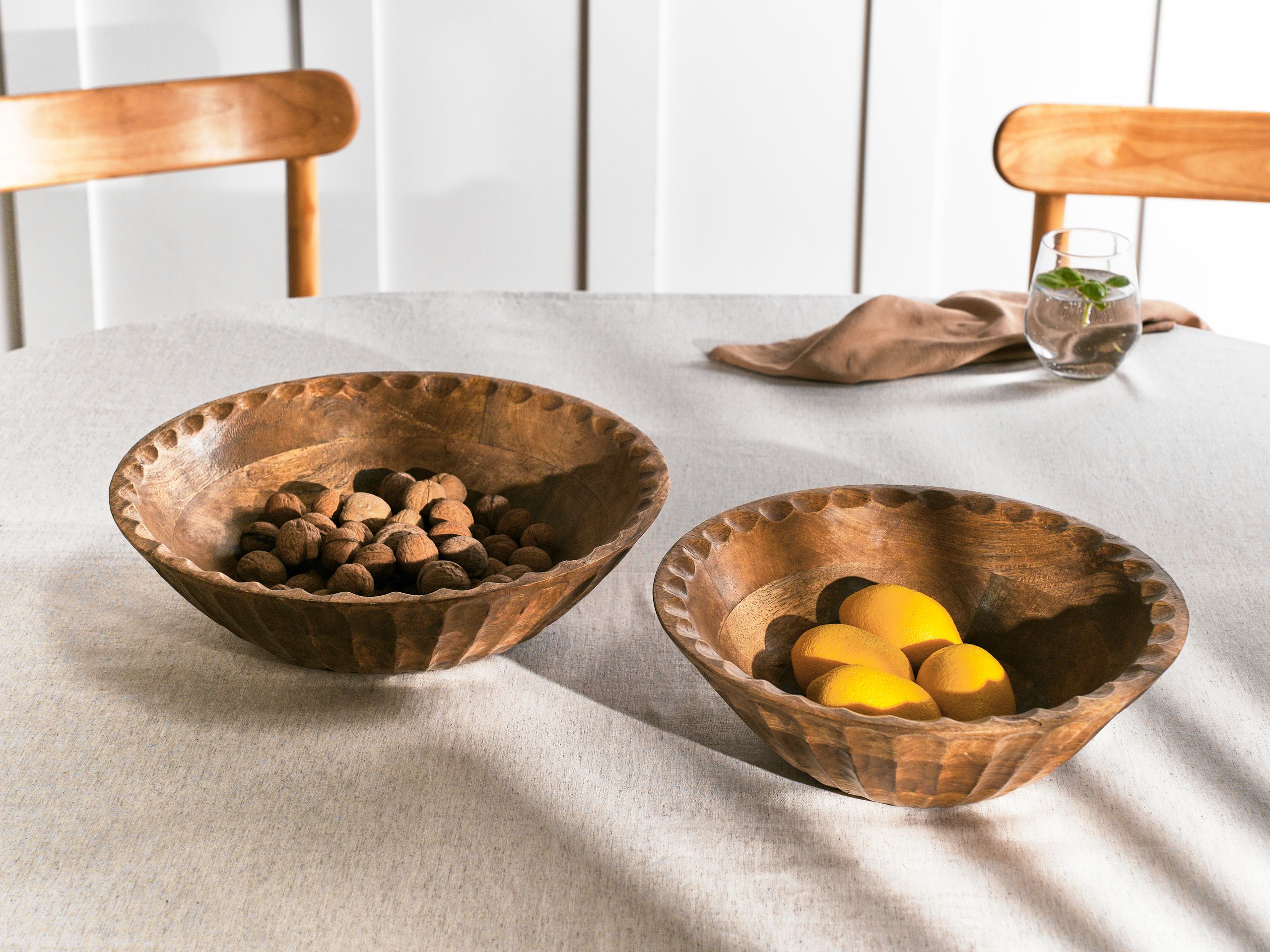 Käsintehty puinen hedelmäkulhosetti. Tämä kahden kulhon setti on täydellinen valinta mihin tahansa keittiöön tai ruokailutilaan, tuoden niihin ripauksen välimerellistä tyyliä. Kestävästä mangopuusta valmistetuissa kulhoissa on näkyvät puun syykuviot, jotka antavat luonnollista viehätystä. Ne sopivat erinomaisesti hedelmien esillepanoon. Ajaton muotoilu tekee niistä erinomaisen lisän monenlaisiin sisustuksiin ja lisää kotiin toiminnallisuutta sekä eleganssia.