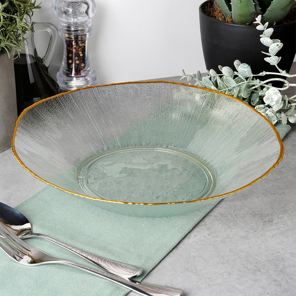 Valmistettu lasista - Valmistettu korkealaatuisesta läpinäkyvästä lasista, jonka rakenne jäljittelee kristallia. Kulhon reuna on kullanvärinen. Oikein käytettynä se kestää useita vuosia.