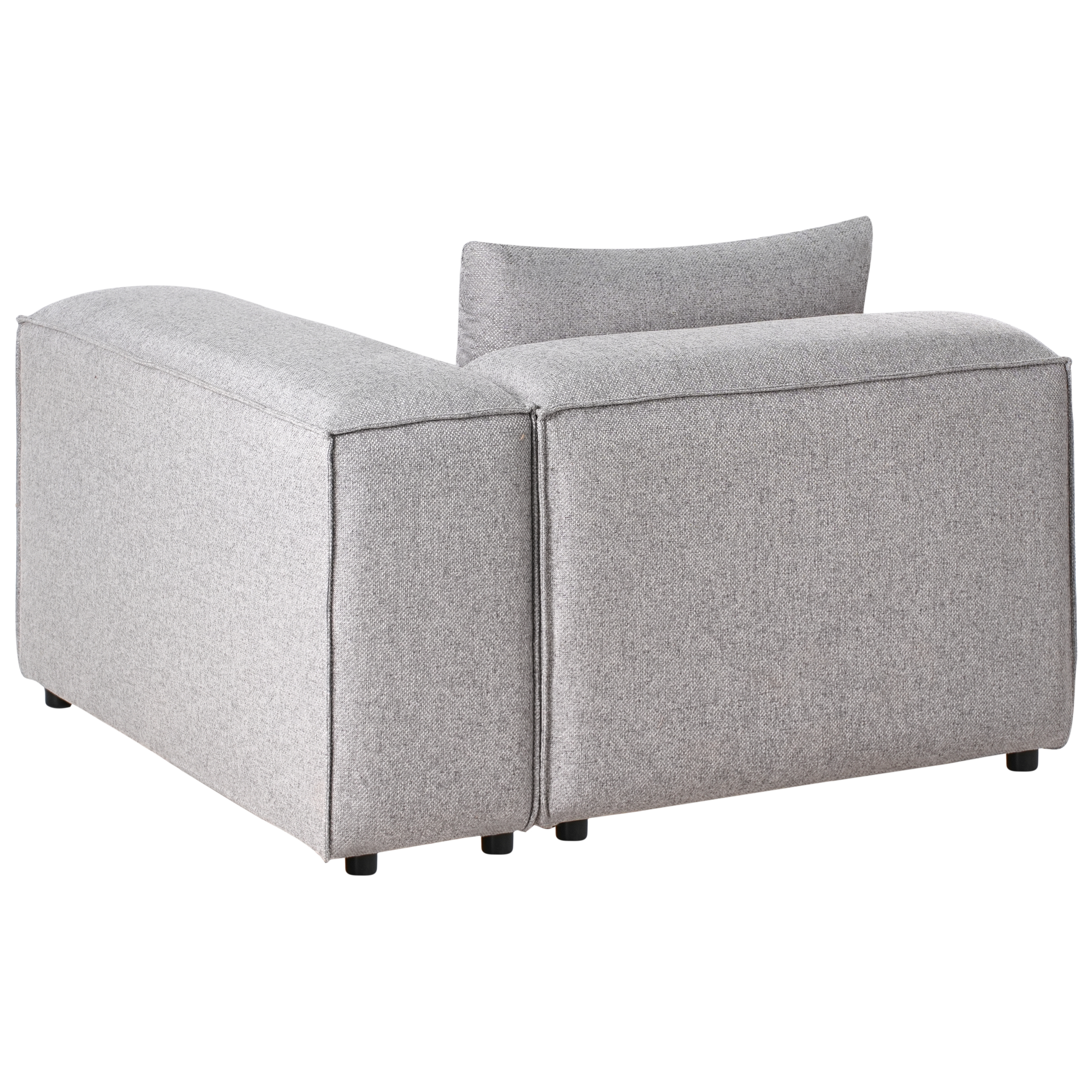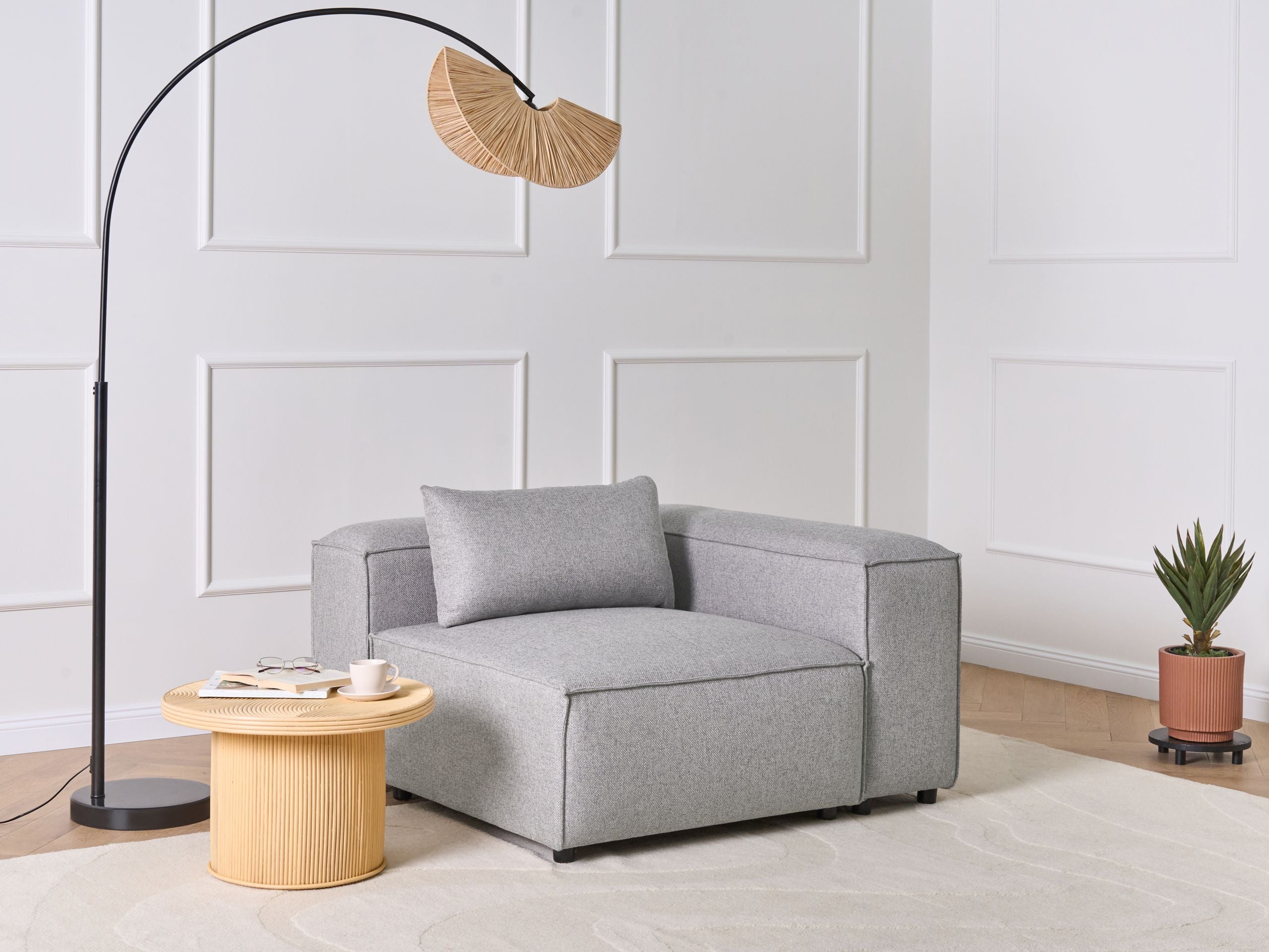 Moderni moduulisohvan kulmapala koristetyynyllä. Tämä monipuolinen ja kompakti kulmamoduuli sopii jokaiseen moderniin sisustukseen. Sen pehmeä ja kestävä polyesteriverhoilu on viimeistelty vettä hylkivällä pinnoitteella, joka pitää roiskeet pinnalla. Tiheä vaahtomuovitäyte tarjoaa mukavuutta ja säilyttää muodon pitkään, kun taas tukeva rakenne mahdollistaa käytön itsenäisenä istuimena tai moduulisohvan jatkeena. Hillitty mutta virtaviivainen muotoilu täydentää vaivattomasti monenlaisia sisustustyylejä, sopien saumattomasti olohuoneeseen. Se tarjoaa erinomaisen yhdistelmän käytännöllisyyttä ja minimalistista tyyliä.