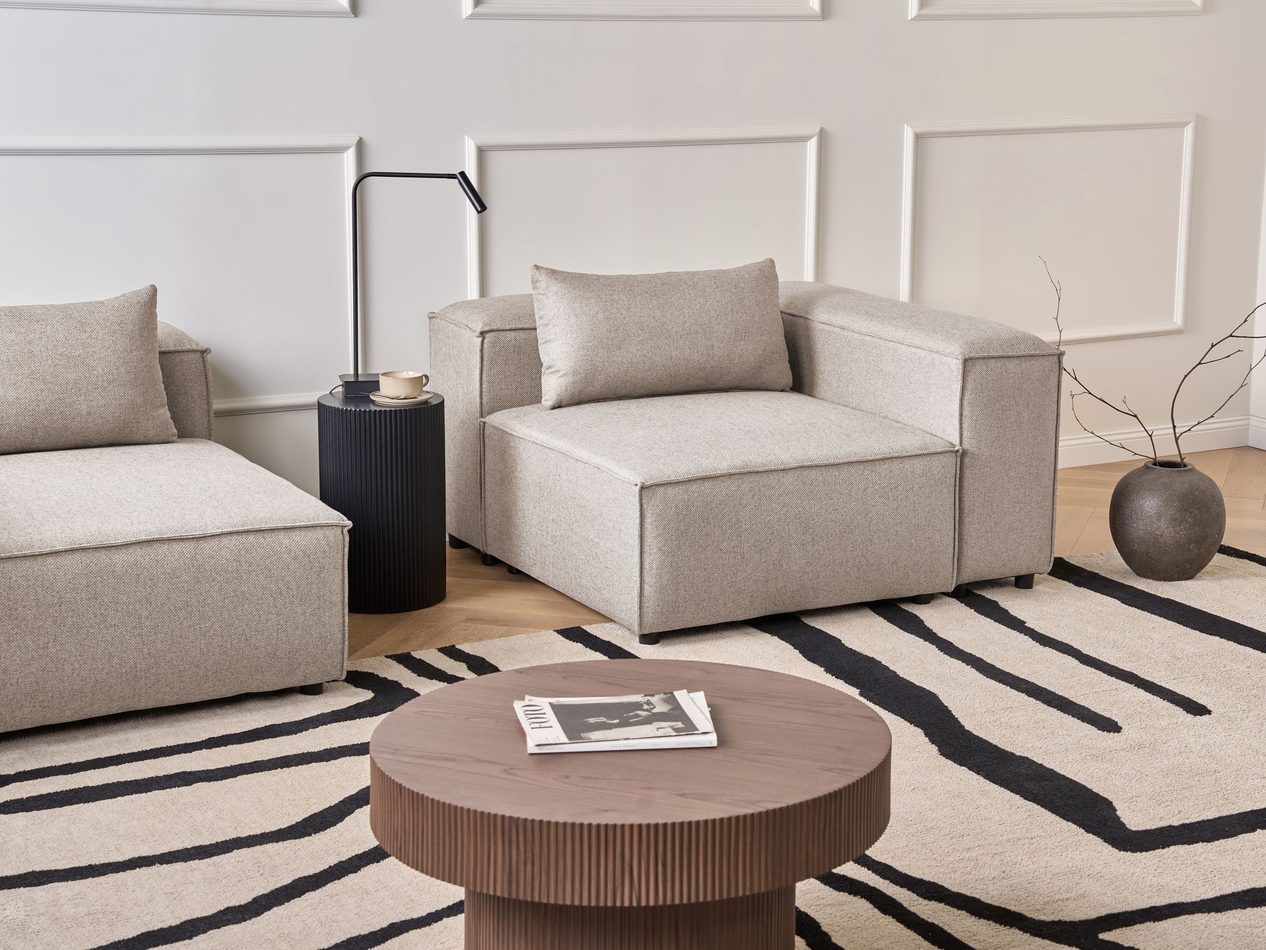 Moderni moduulisohvan kulmapala koristetyynyllä. Tämä monipuolinen ja kompakti kulmamoduuli sopii jokaiseen moderniin sisustukseen. Sen pehmeä ja kestävä polyesteriverhoilu on viimeistelty vettä hylkivällä pinnoitteella, joka pitää roiskeet pinnalla. Tiheä vaahtomuovitäyte tarjoaa mukavuutta ja säilyttää muodon pitkään, kun taas tukeva rakenne mahdollistaa käytön itsenäisenä istuimena tai moduulisohvan jatkeena. Hillitty mutta virtaviivainen muotoilu täydentää vaivattomasti monenlaisia sisustustyylejä, sopien saumattomasti olohuoneeseen. Se tarjoaa erinomaisen yhdistelmän käytännöllisyyttä ja minimalistista tyyliä.