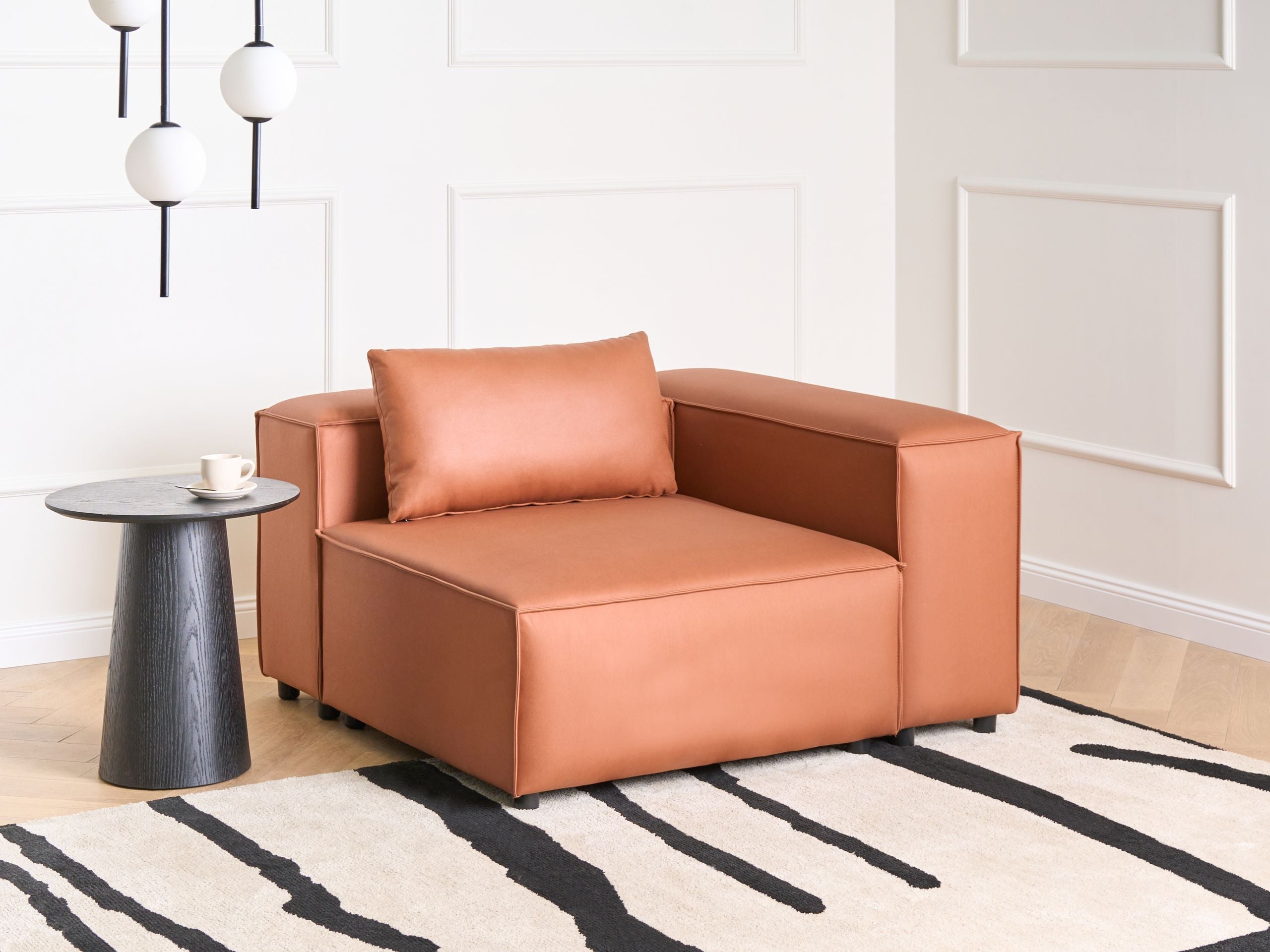 Moderni moduulisohvan kulmapala koristetyynyllä. Tämä monipuolinen ja kompakti kulmamoduuli sopii jokaiseen moderniin sisustukseen. Sen pehmeä ja kestävä vegaaninen ekonahkaverhoilu on helppo puhdistaa, ja se on viimeistelty tyylikkäällä mattapinnalla. Tiheä vaahtomuovitäyte tarjoaa mukavuutta ja säilyttää muodon pitkään, kun taas tukeva rakenne mahdollistaa käytön itsenäisenä istuimena tai moduulisohvan jatkeena. Hillitty mutta virtaviivainen muotoilu täydentää vaivattomasti monenlaisia sisustustyylejä, sopien saumattomasti olohuoneeseen. Se tarjoaa erinomaisen yhdistelmän käytännöllisyyttä ja minimalistista tyyliä.