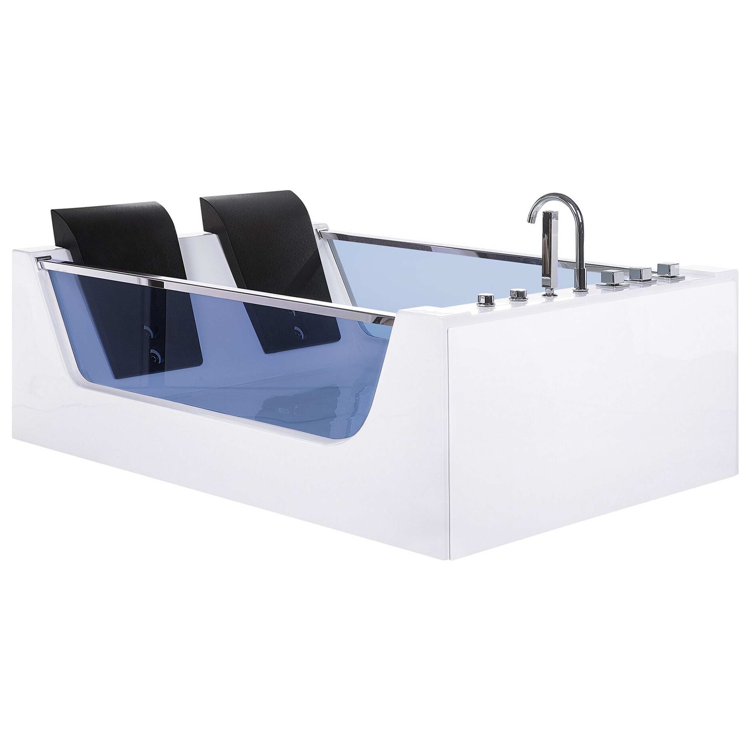 Ylellinen kahden hengen poreamme lasiseinillä. Tuo kotiisi kylpylämaista tunnelmaa tällä modernilla poreammeella. Mustat ja hopeiset yksityiskohdat luovat kontrastia ammeen suoralinjaiseen muotoiluun ja klassiseen valkoiseen väritykseen. Vedenalainen LED-valaistus ja useat suihkusuuttimet takaavat rentouttavan kokemuksen. Ammeen sinisen sävyiset läpinäkyvät lasipaneelit heijastavat kauniita sävyjä koko kylpyhuoneeseesi luoden sinne rauhoittavaa tunnelmaa.