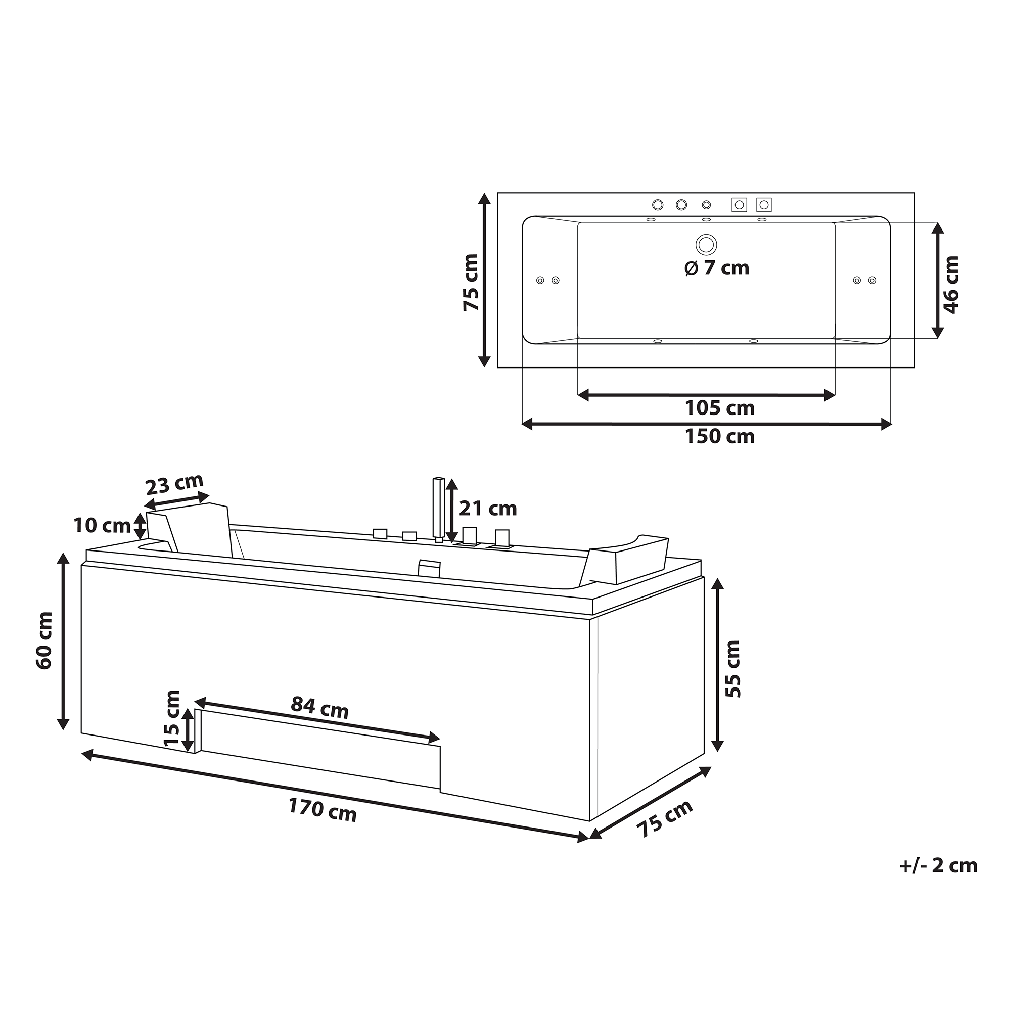 Ominaisuudet: Viemärijärjestelmä ylivuotosäädöllä, Vedenalainen LED-valo, Vesihierontasuuttimet jaloille, Mukava niskatuki, Ylellinen muotoilu