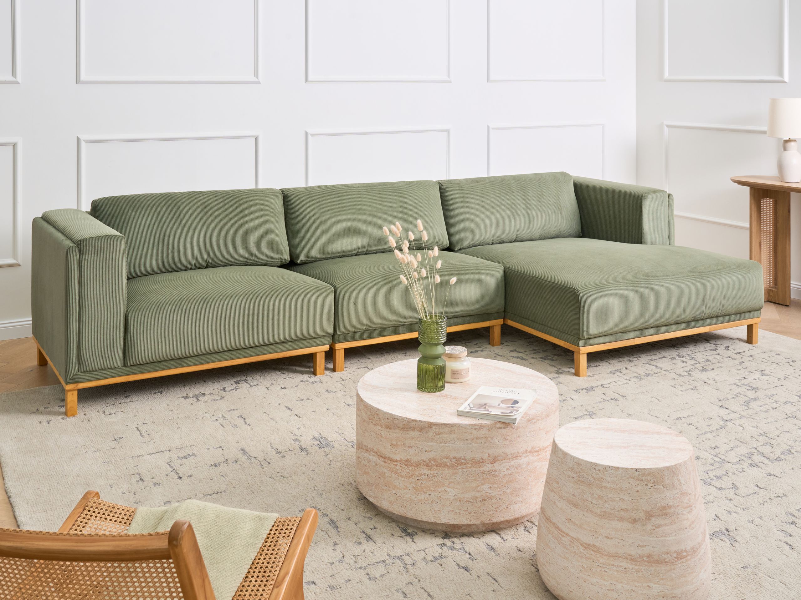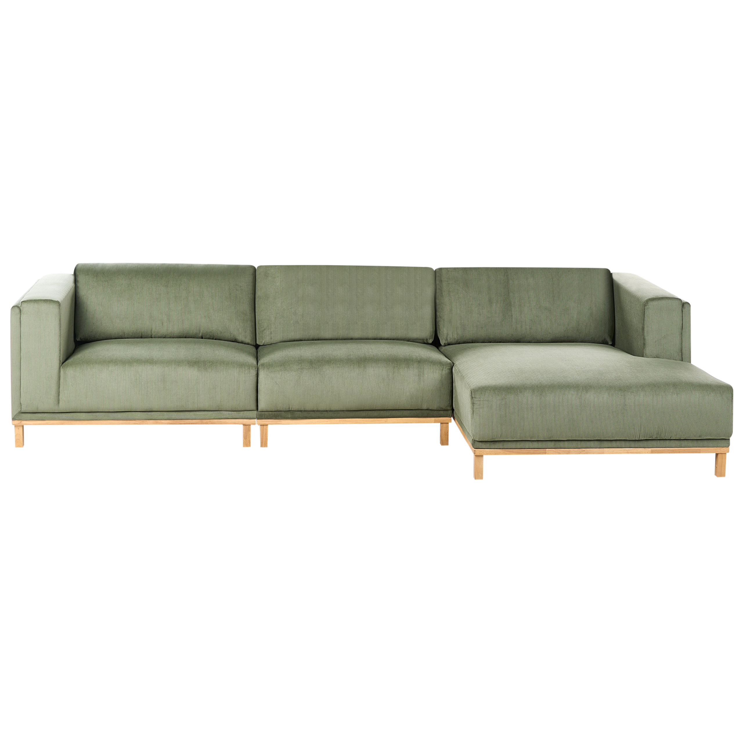 Moderni verhoiltu divaanisohva puujaloilla. Lisää olohuoneeseen mukavuutta ja tyyliä tällä tilavalla kulmasohvalla, jolle mahtuu jopa viisi henkeä. Sohvan runko on verhoiltu kestävällä vakosametilla, jota täydentävät paksu pehmustus ja leveä divaani, joka sijaitsee istujan näkökulmasta vasemmalla. Vaaleat, massiivipuusta valmistetut jalat takaavat vakauden ja täydentävät verhoilun vihreää väriä. Sohva sopii täydellisesti jokaiseen moderniin tai perinteiseen sisustukseen.