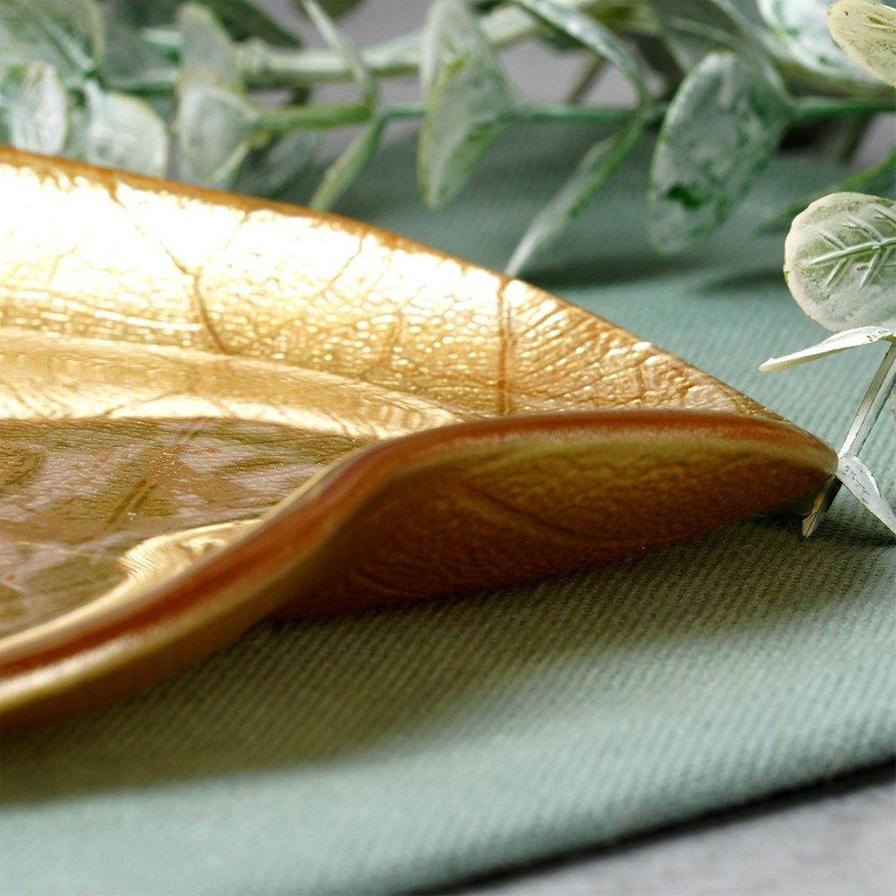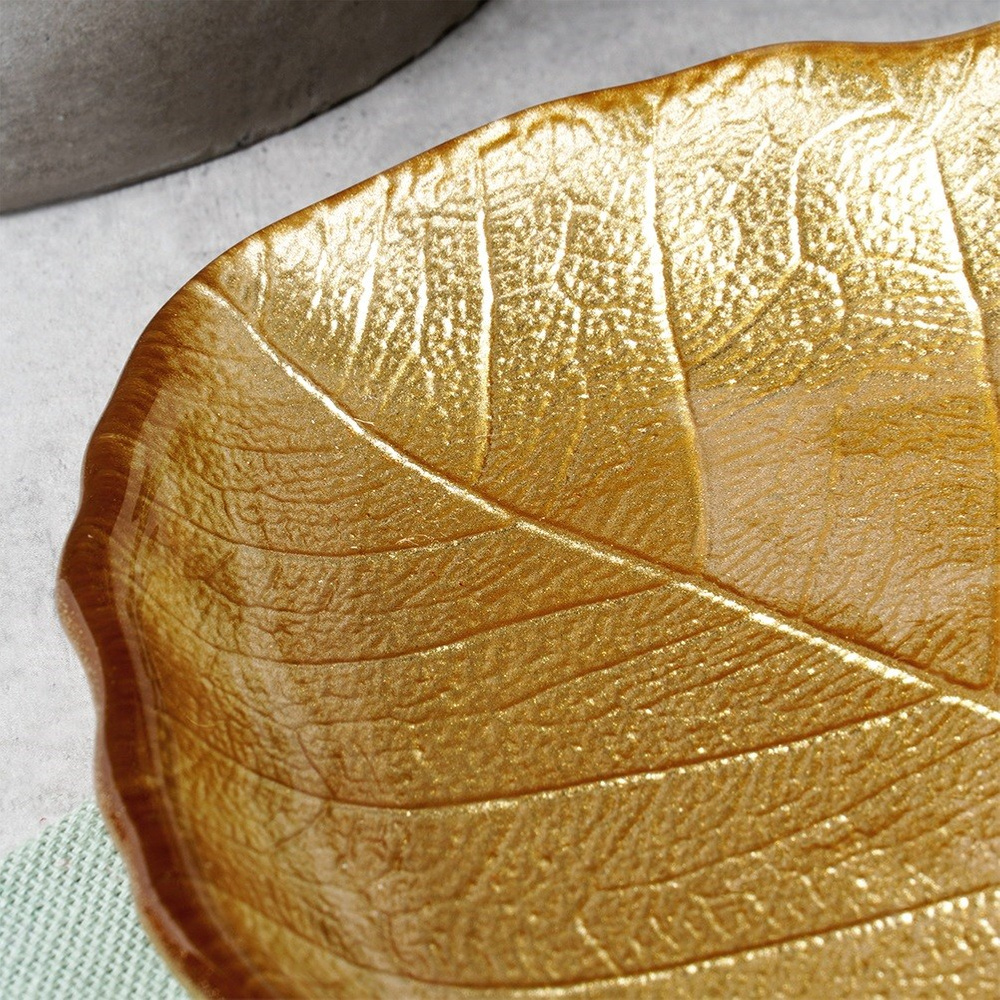 Valmistettu lasista - Valmistettu korkealaatuisesta kullanvärisestä lasista. Lautasen kuvio on saanut inspiraationsa lehden rakenteesta. Hienovaraiset linjat ja tekstuuri antavat lautaselle lehtimäisen ulkonäön, mikä lisää pöytään ainutlaatuisen ja elegantin ilmeen.