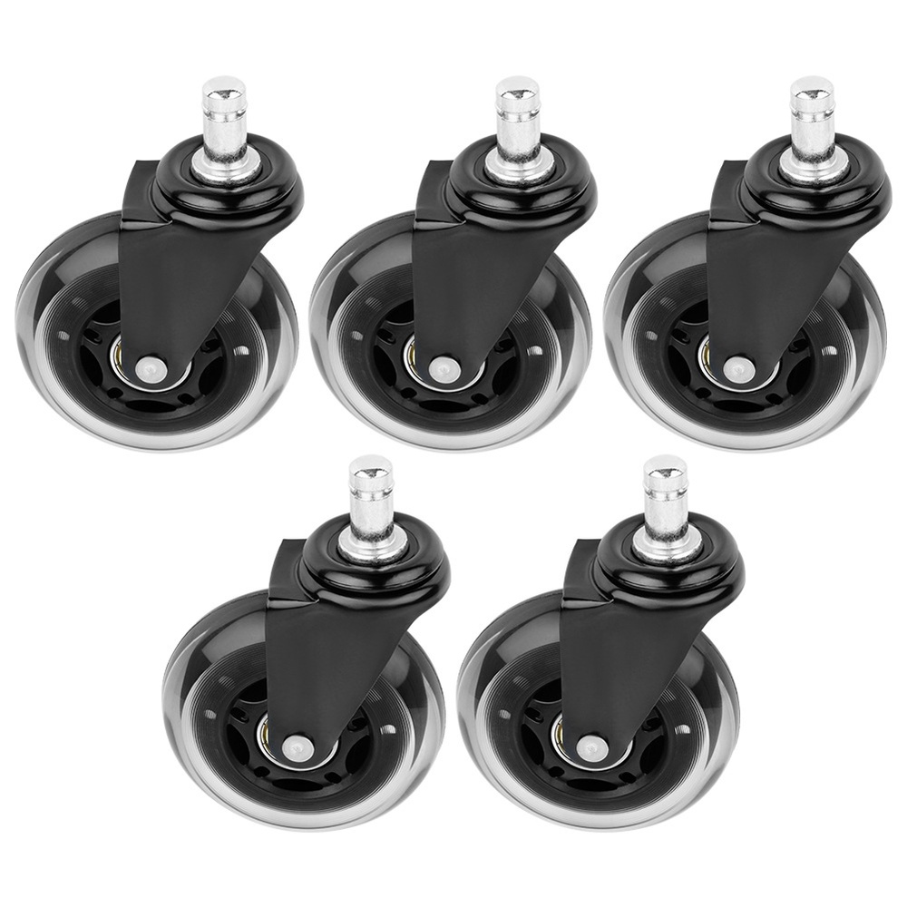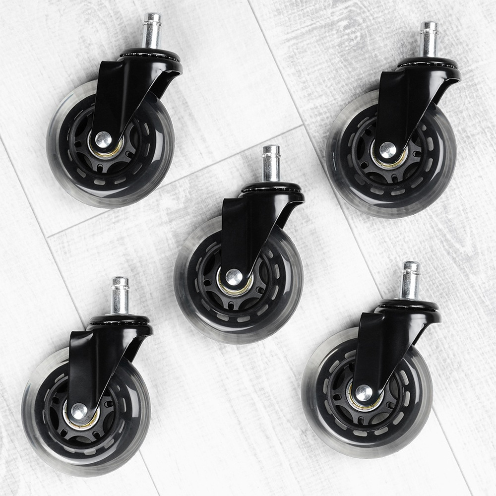 5 kpl työtuolin vaihtopyöriä - Viiden kpl työtuolin vaihtopyöriä. Kunkin pyörän halkaisija on 7,5 cm. Kiinnitystapin halkaisija on 11 mm. Ne varmistavat tuolin hiljaisen ja tasaisen liikkeen.