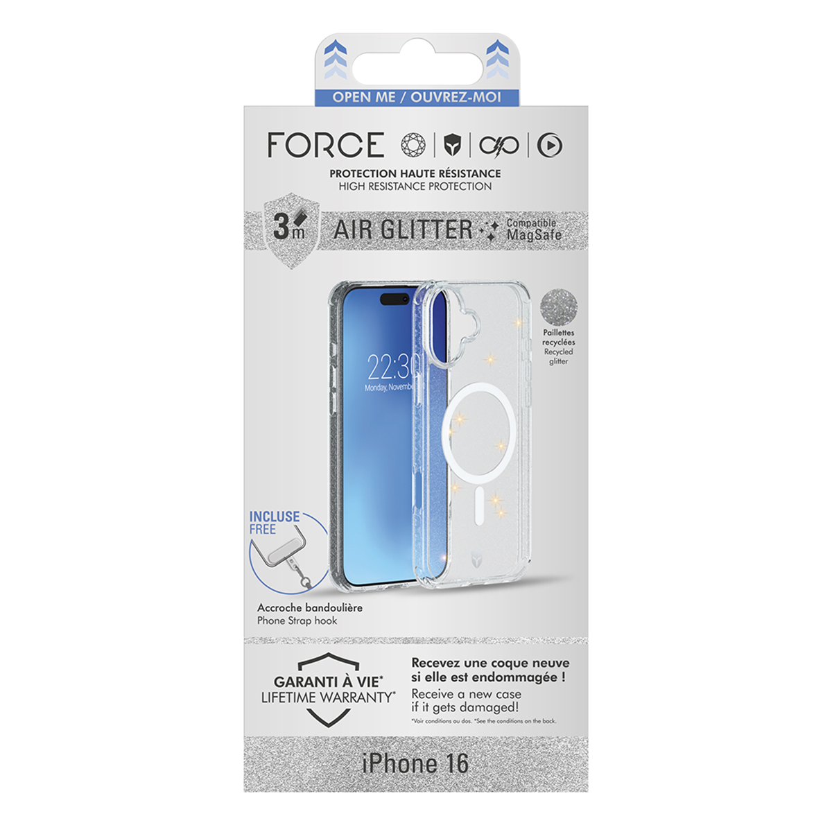 Tämä läpinäkyvä MagSafe AIR ForceCase iPhone 16:lle on yksi markkinoiden kovimmista koteloista. Siinä on Air Cushion -teknologia ja Tryax Inserts 3D -järjestelmä, jonka vahvistetut kulmat pehmentävät 3 metristä pudotettaessa aiheutuvia iskuja. Kimaltavat paljetit antavat kotelolle hienon ilmeen, joka korostaa iPhoneasi.