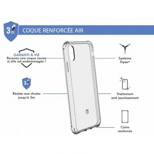 Tämä vahvistettu kotelo iPhone XS Max AIR -puhelimelle on erittäin kestävä suojaava lisävaruste älypuhelimellesi. Siinä on tyylikäs läpinäkyvä viimeistely ja mukautettu vahvistettu muotoilu, joka kestää iskuja ja pudotuksia 2 metristä. Kuori on valmistettu muovista ylimääräisen kestävyyden takaamiseksi.