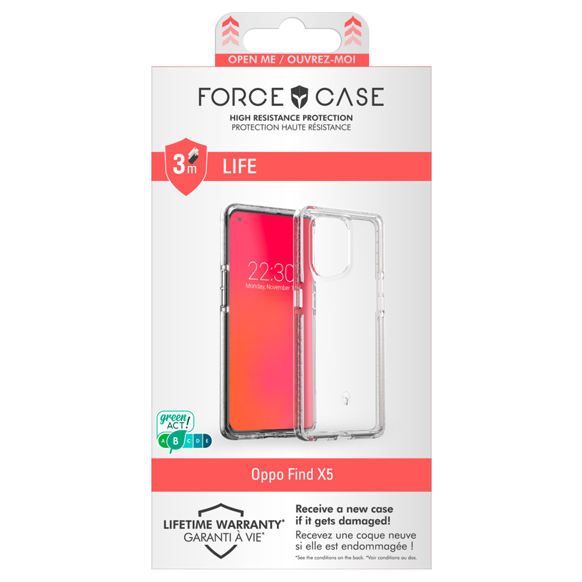 Oppo Find X5 LIFE -vahvistettu suojakuori on erittäin kestävä älypuhelimen suojavaruste. Siinä on tyylikäs läpinäkyvä viimeistely ja räätälöity vahvistettu muotoilu, joka kestää iskuja ja pudotuksia 3 metristä. Kuori on valmistettu muovista ylimääräisen kestävyyden takaamiseksi.