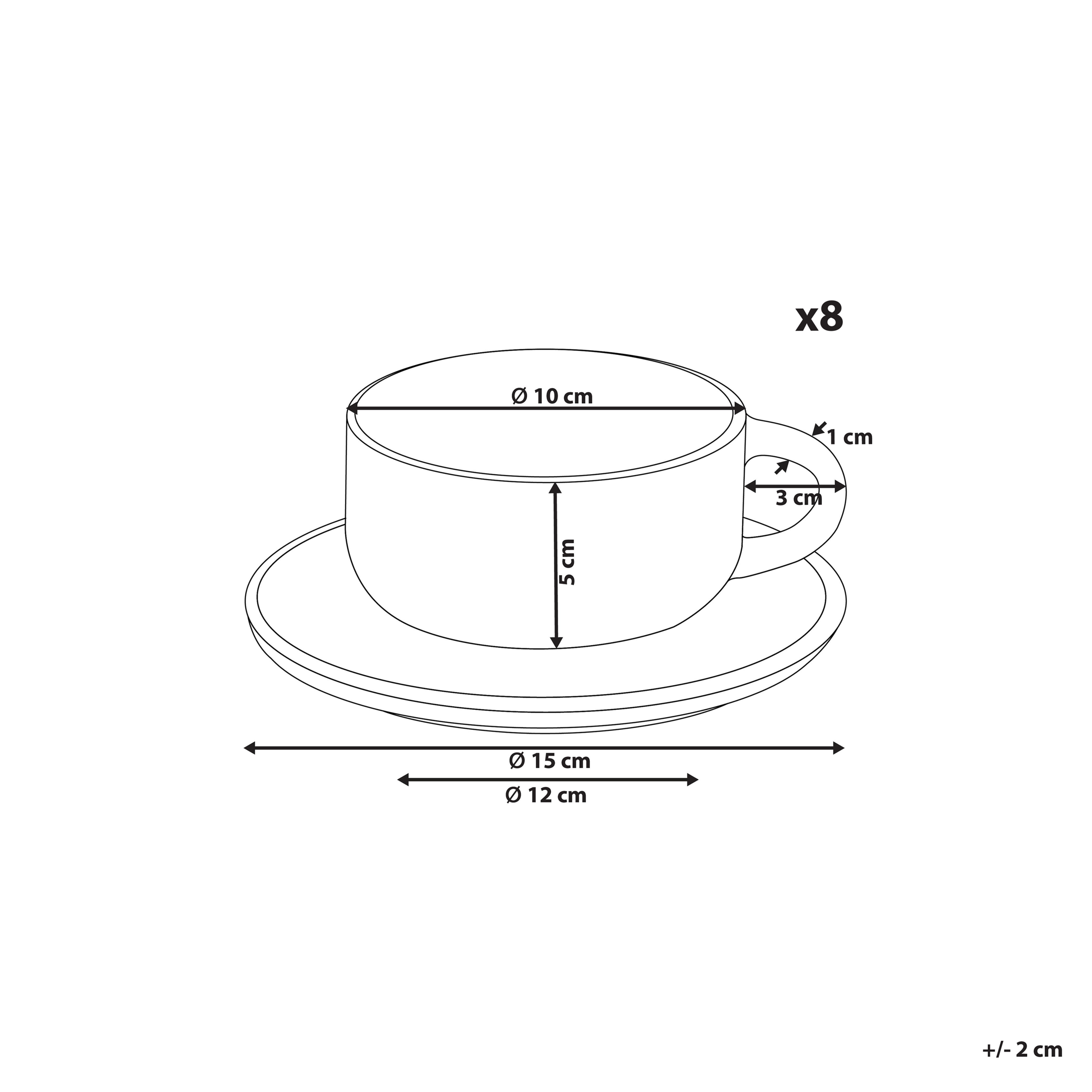 Käsintehty teekuppisetti kahdeksalle hengelle. Tämä kahdeksan kupin ja asetin setti yhdistää ajattoman eleganssin ja jokapäiväisen käytännöllisyyden täydellisesti. Kestävästä kivitavarasta käsin valmistettu setti on astianpesukoneen ja mikroaaltouunin kestävä, mikä lisää käyttömukavuutta. Jokaisessa kupissa ja aluslautasessa on persoonallinen viimeistely, joka korostaa niiden omaperäisyyttä ja tuo juomahetkiin hienostuneisuutta. Monipuolisen värimaailman ja klassisen muotoilun ansiosta ne täydentävät vaivattomasti monenlaisia sisustuksia ja tekevät kestävän vaikutuksen tyylin ja toiminnallisuuden yhdistelmällään.