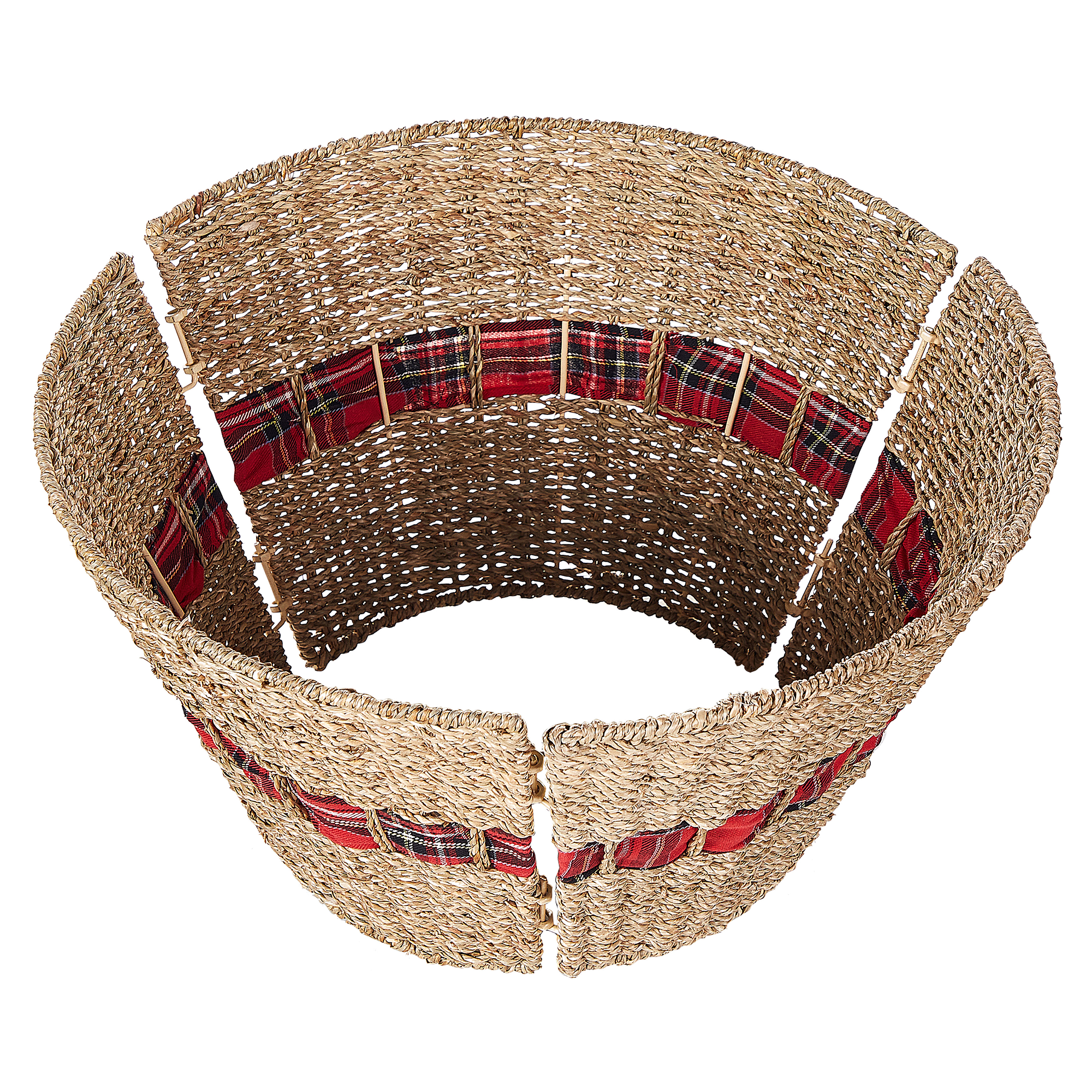 Käsintehty joulukuusen kaulus. Tämä tyylikäs kuusenjalan suojus tuo joulukuuseesi boho-tunnelmaa. Lisäksi se suojaa kuusen runkoa tai, jos sinulla on kuusenjalusta, piilottaa sen trendikkään muodon sisään. Kaulus on valmistettu käsin meriruohosta ja koristeltu punaisella nauhalla. Se on myös erittäin kestävä ja vaatii vain vähän ylläpitoa kestääkseen monet joulut.